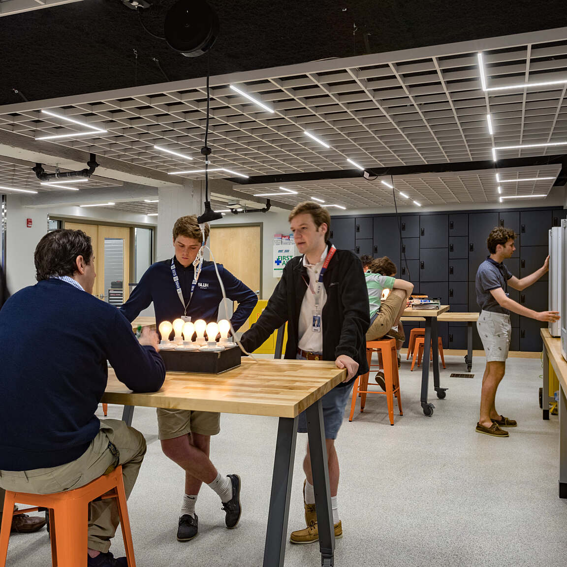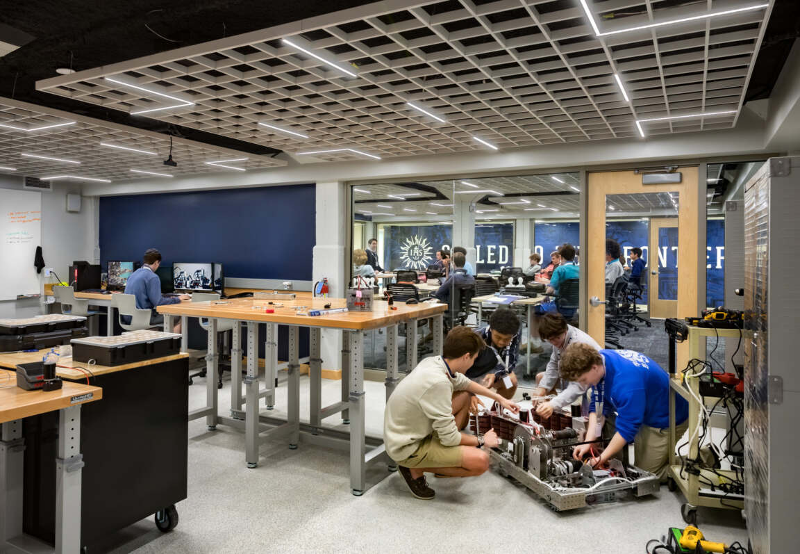 The renovation of the Saint Louis University High School James Guth Costigan Innovation Lab transformed the lower level of an older academic building into a vibrant hub for innovation and experiential learning. Ductwork was placed within walls to keep ceiling space open, black sound-absorbing material was applied to the slab to visually minimize the low ceiling, and a ceiling grid system with integrated lighting helped maintain an open, modern feel. Extensive use of glass created transparency, shared light, and a sense of openness throughout the space.