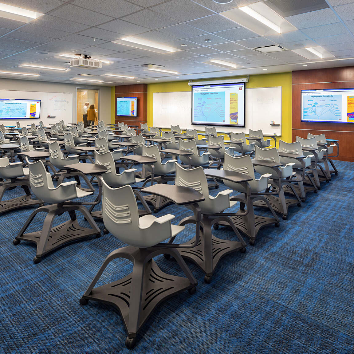 The updated Macelwane Hall now houses a variety of spaces to support both teaching and research activities. It includes lower- and upper-division teaching laboratories, research labs, classrooms, administrative and faculty offices, student gathering areas, and common and support spaces. Specialized facilities such as a bioinformatics/computation lab, aquatics laboratory, and a plant growth chamber are located on the first floor, while the second floor offers classrooms, offices, and additional laboratories. The third floor features laboratories equipped for biochemistry, molecular technology, neuroscience, physiology, and genetics research.