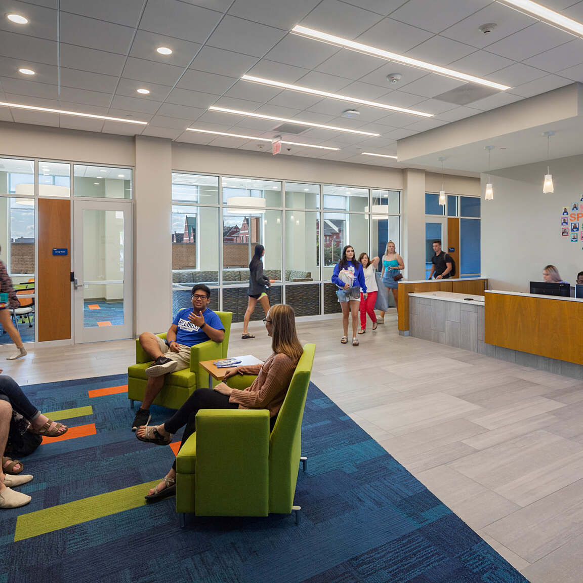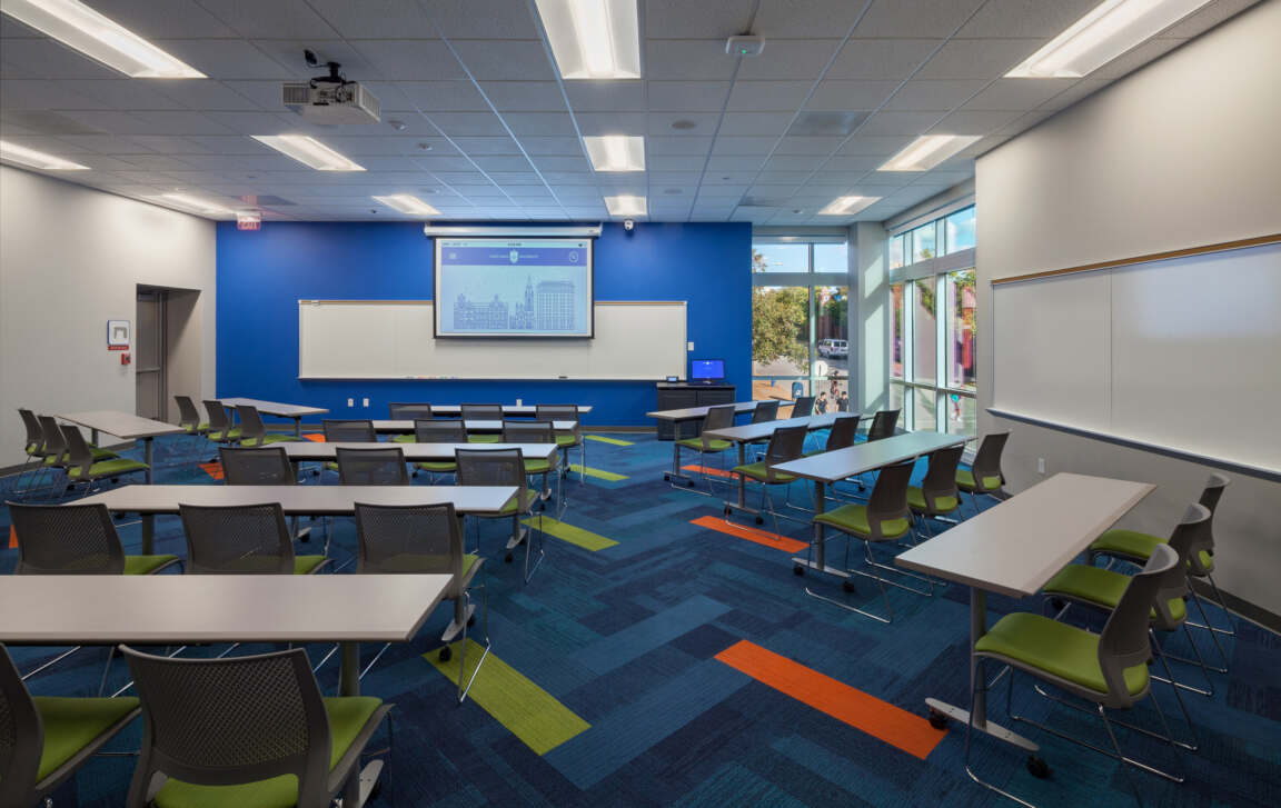 Sun-filled lounges and study rooms are located on each floor, most with expansive views to the surrounding city. Student organizations are making use of conference rooms and classrooms equipped with teleconferencing capabilities. Students wishing to practice an instrument can use one of two acoustically isolated music practice rooms.