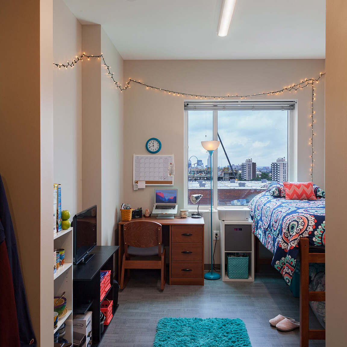 A range of amenities supports a collaborative student lifestyle, with a focus on integrating academics and student life. A chapel, community kitchen, and community living room encourage students to share their spiritual and cultural traditions. Sun-filled lounges and study rooms are located on each floor, most with expansive views to the surrounding city. Student organizations are making use of conference rooms and classrooms equipped with teleconferencing capabilities. Students wishing to practice an instrument can use one of two acoustically isolated music practice rooms.