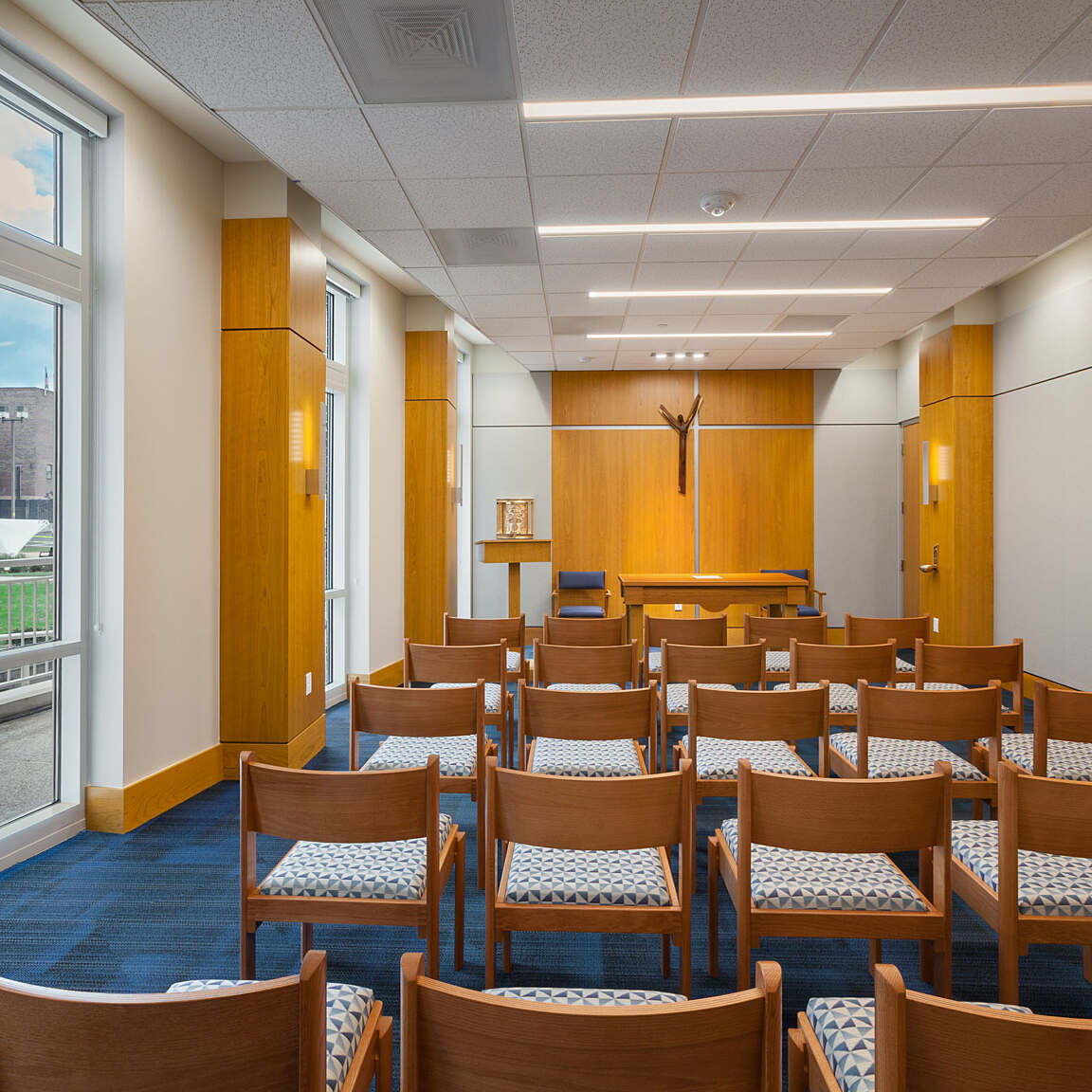 An office suite on the main level serves staff of Spring Hall as well as the campus minister. Nearby are flexible hoteling suites for faculty who use the facility’s classrooms.