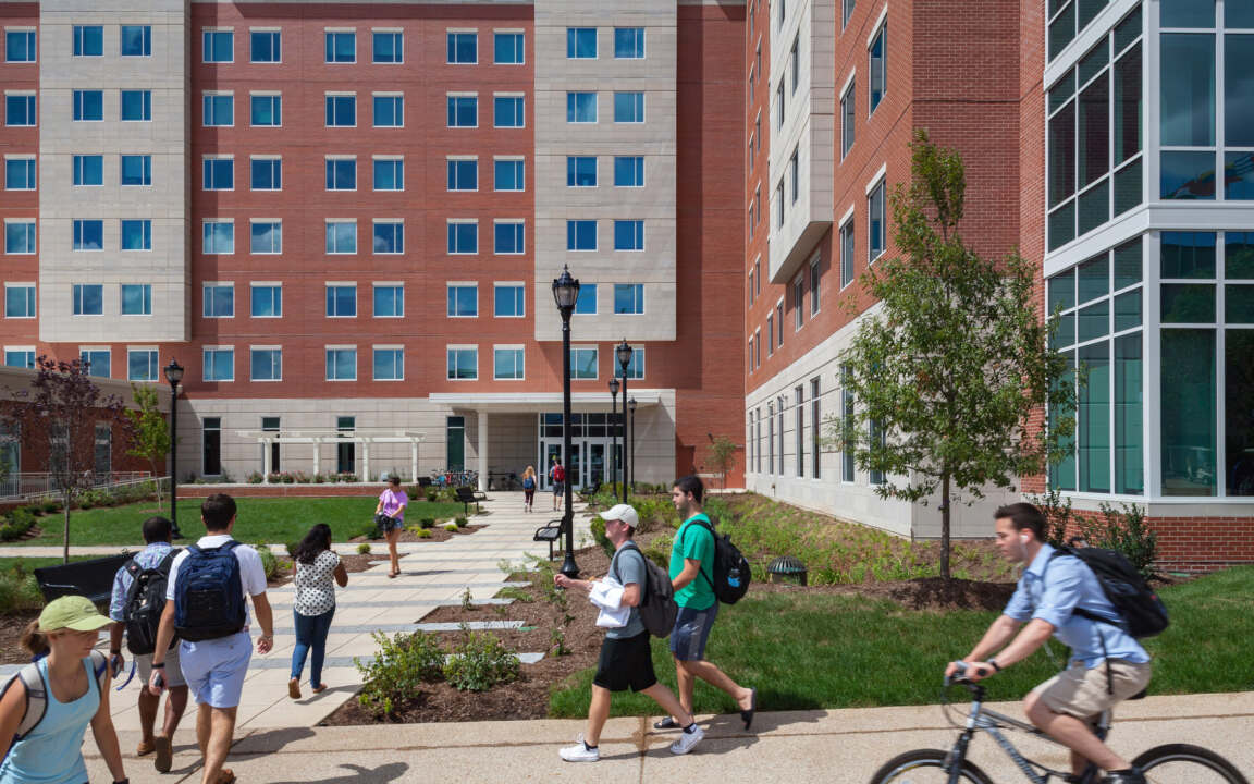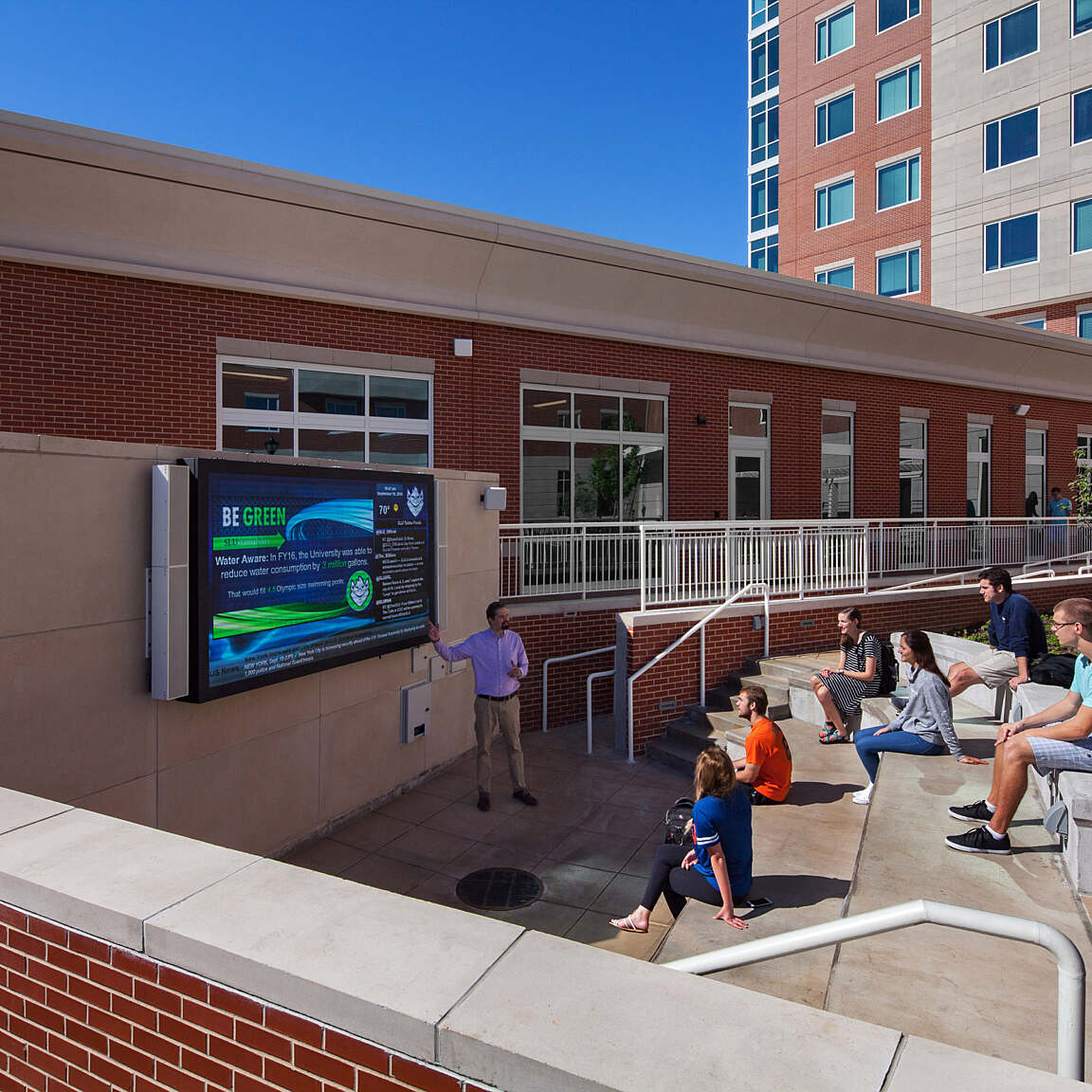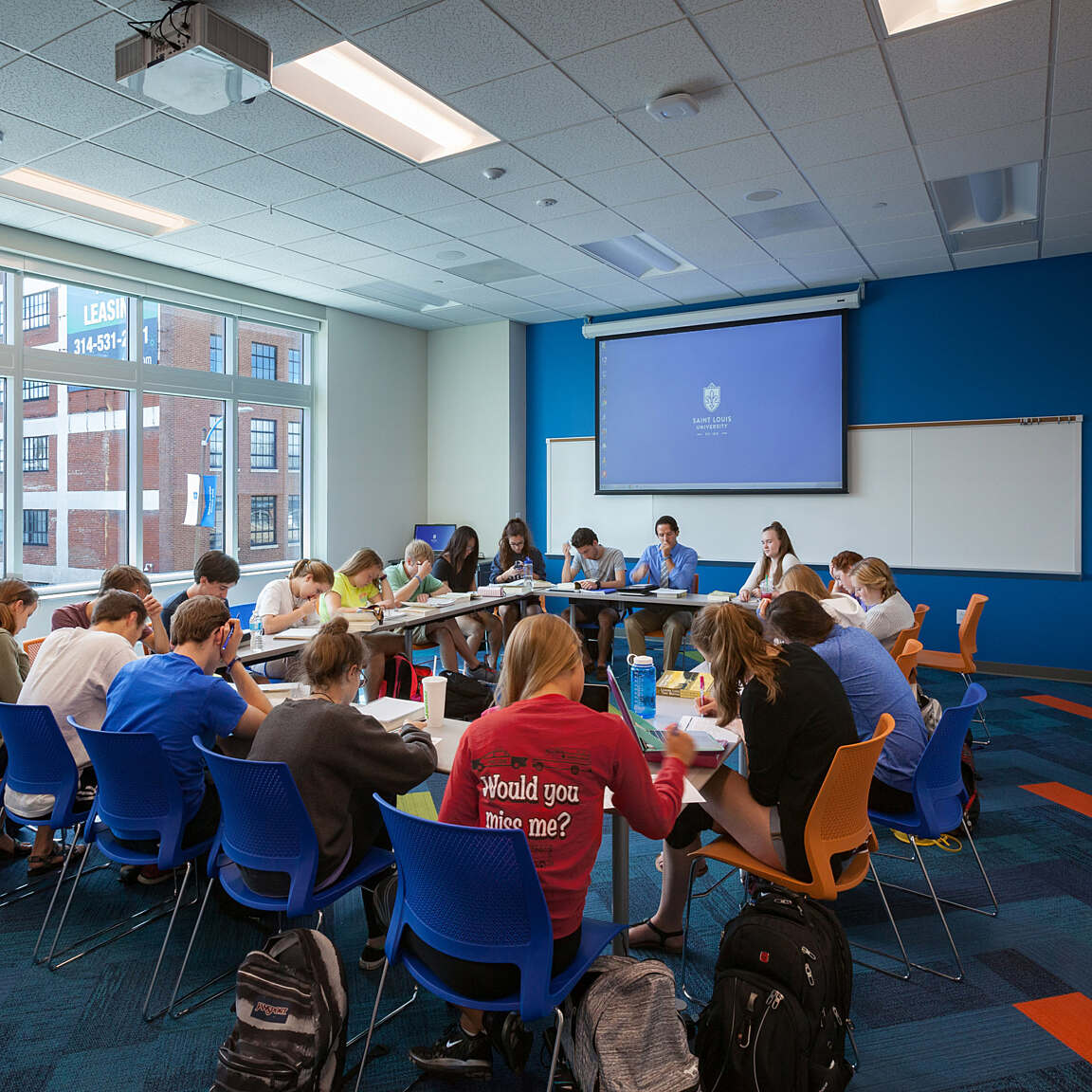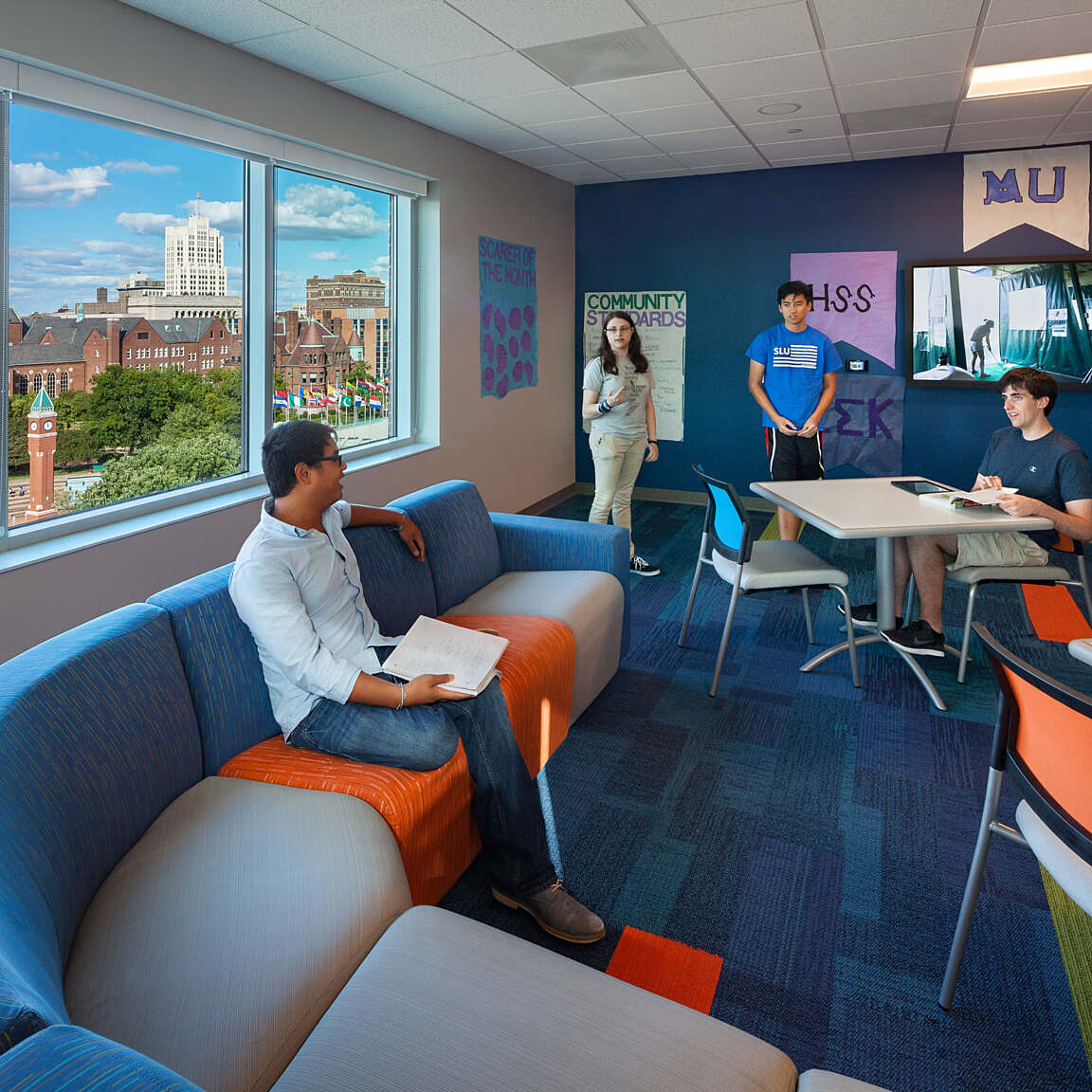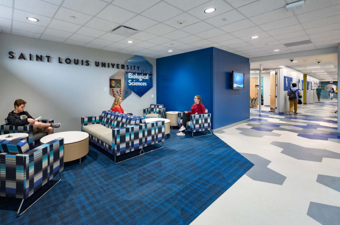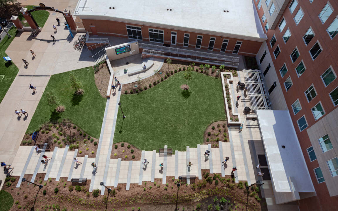 The exterior building materials are designed to harmonize with Saint Louis University’s historic context. The façade incorporates brick with cast stone that mimics the limestone prevalent on campus. A large outdoor courtyard creates a central gathering space for students, and includes a “front porch” with a pergola, fire pits, and integrated benches. Also included is a large outdoor television and sound system surrounded by tiered seating that can be used for both classes and resident movie nights.