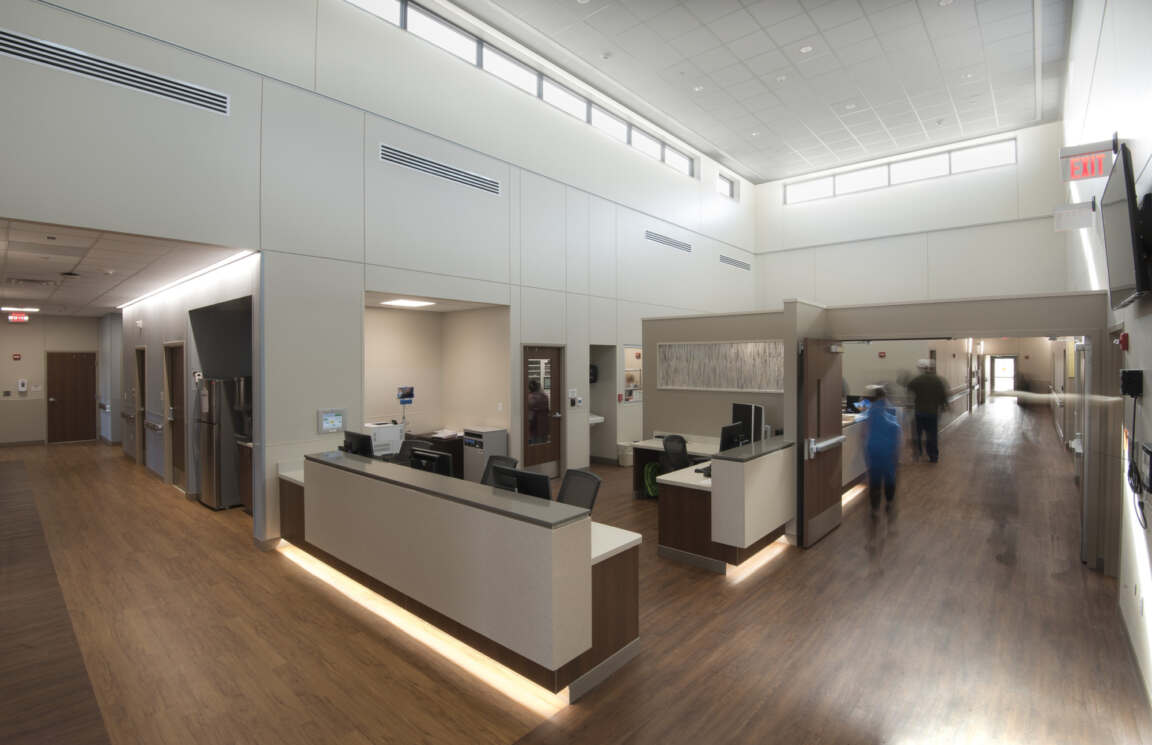 A nurses’ station with lofty ceilings bordered by clerestory windows is centrally located between the inpatient and emergency service departments.