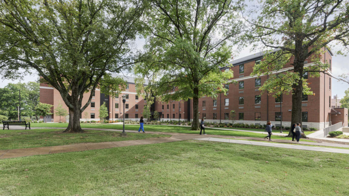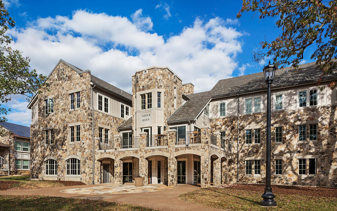 The new LEED Silver certified residence hall stands on the former location of Van Ness Hall on the edge of Alabama Ave. on Sewanee's iconic campus. Much care was given to incorporate Sewanee's rich history - the first floor common room fireplace is built from stones re-purposed from the Van Ness exterior. Ayres is home to 114 students living in double and single rooms. Each wing has two hall baths and each floor has one single-use bath. The closets, built in the wall, are without doors, avoiding wear and tear.