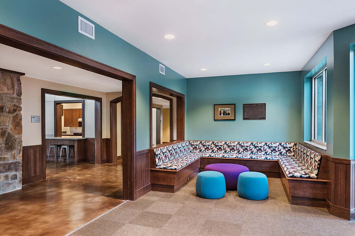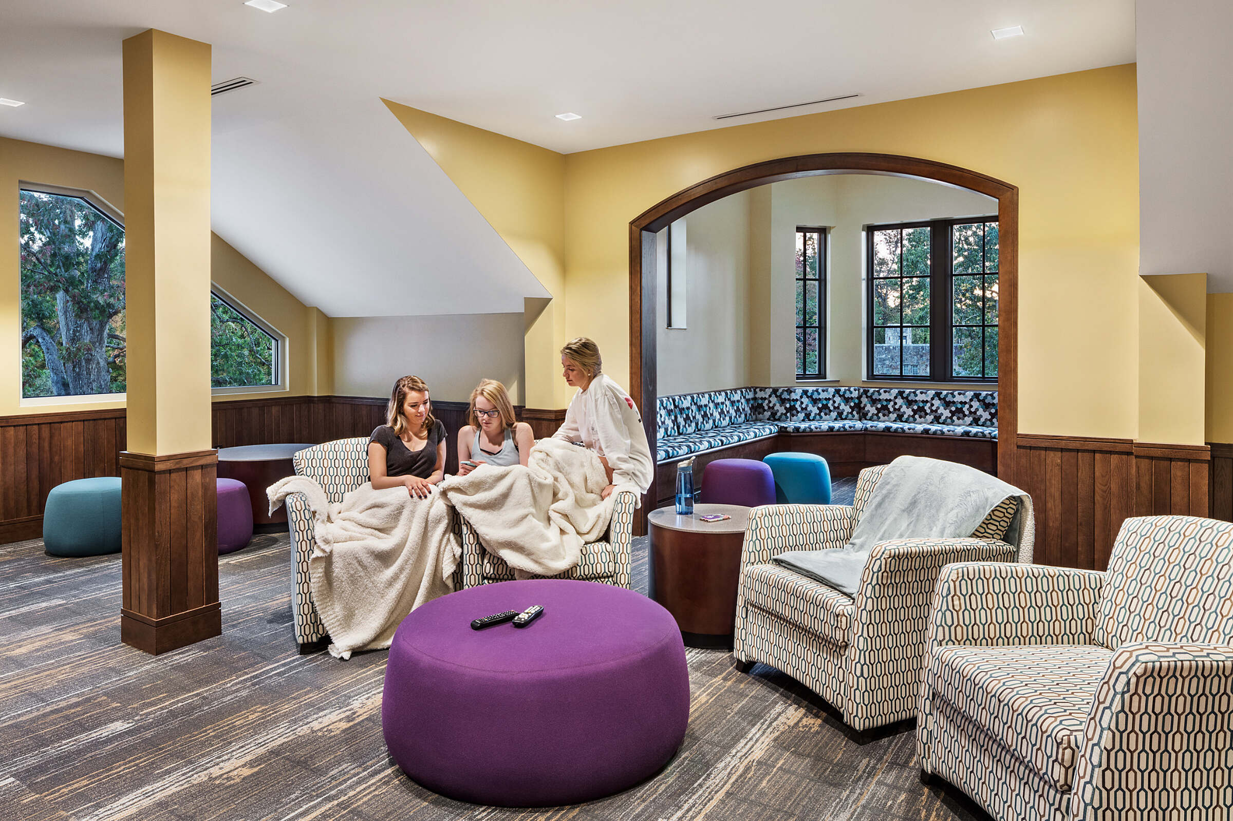 Common rooms have been incorporated into the first and third floors, creating living rooms and den-like spaces with comfortable and flexible seating. The third floor common room is equipped with cable television and a large projector screen for movie nights. While the large-space format is capable of accommodating a large group, often students equally love the small-spaces that can easily be created within the large space.