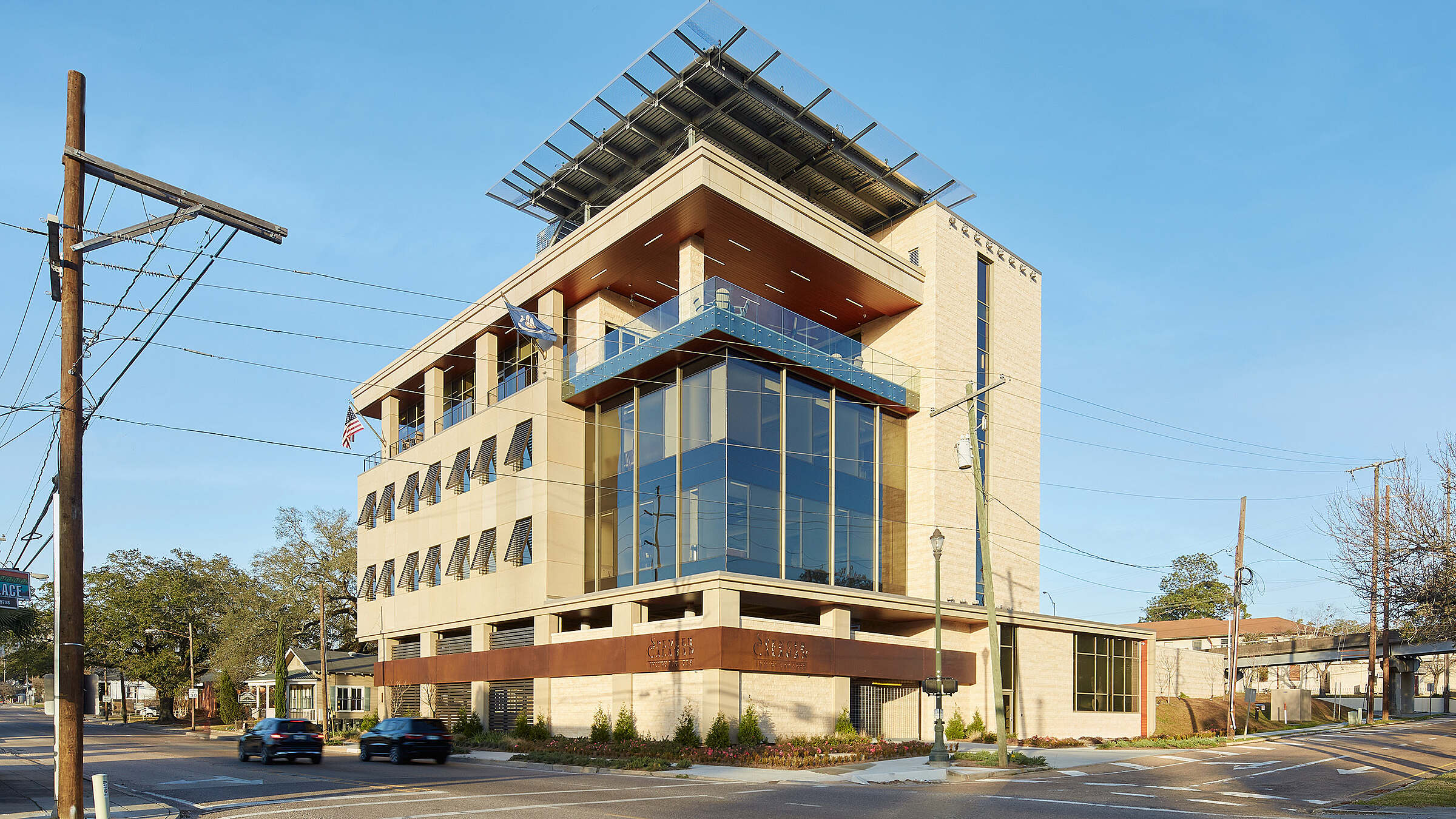 The new law offices of Spencer Calahan Injury Lawyers take full advantage of the site’s prominent Baton Rouge location. The 26,000 SF office building spans five stories, including two levels of parking, three levels of office space, a rooftop helipad, and a 1,300 SF deck with river and downtown views.