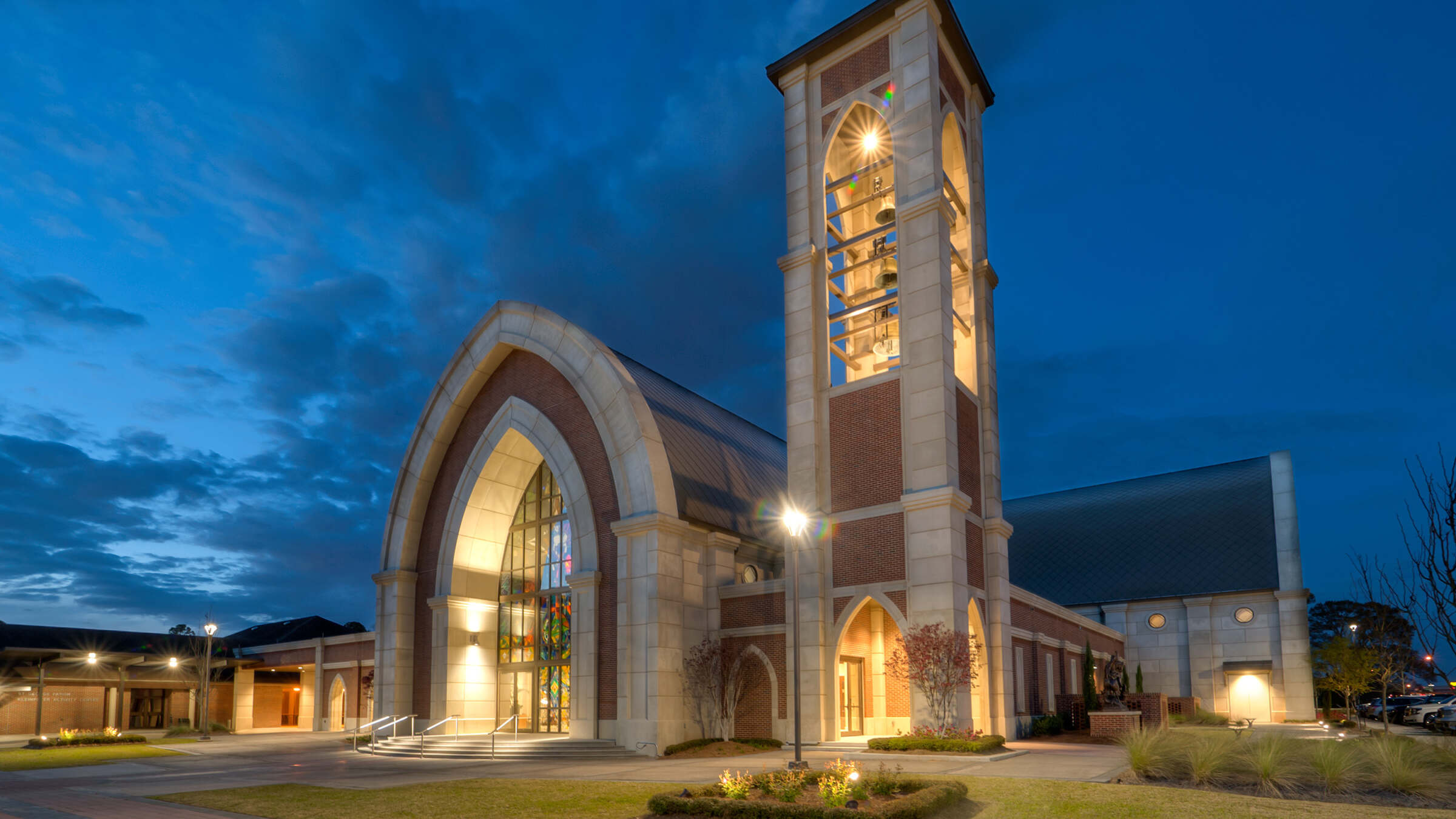 Our firm worked with St. George Catholic Church leaders and parishioners to develop a master plan that centered on a new place of worship. After spending 50 years in a facility that was not originally built as a church, the parish’s goal was to create a welcoming and community-oriented environment that would speak to all generations of the St. George family, artfully balancing traditional liturgical architecture with contemporary elements such as projection screens. The firm ultimately designed a 1,200-seat church that includes a 120-person chapel. Exterior courtyards at both the main entry and the chapel entry encourage community interaction. This simple, yet elegant, design takes inspiration from a variety of transcendental Christian motifs. For example, the Gothic arch theme is repeated gracefully throughout the structure, most prominently in the entryway, but also in the soaring, vaulted sanctuary ceiling.