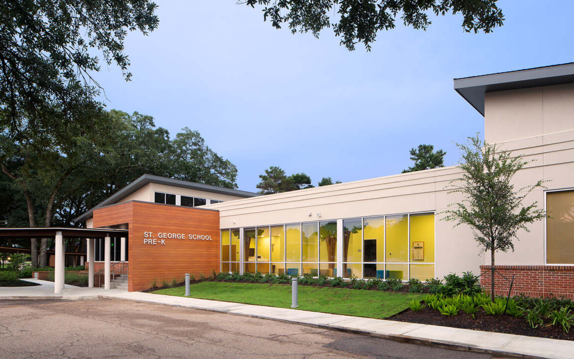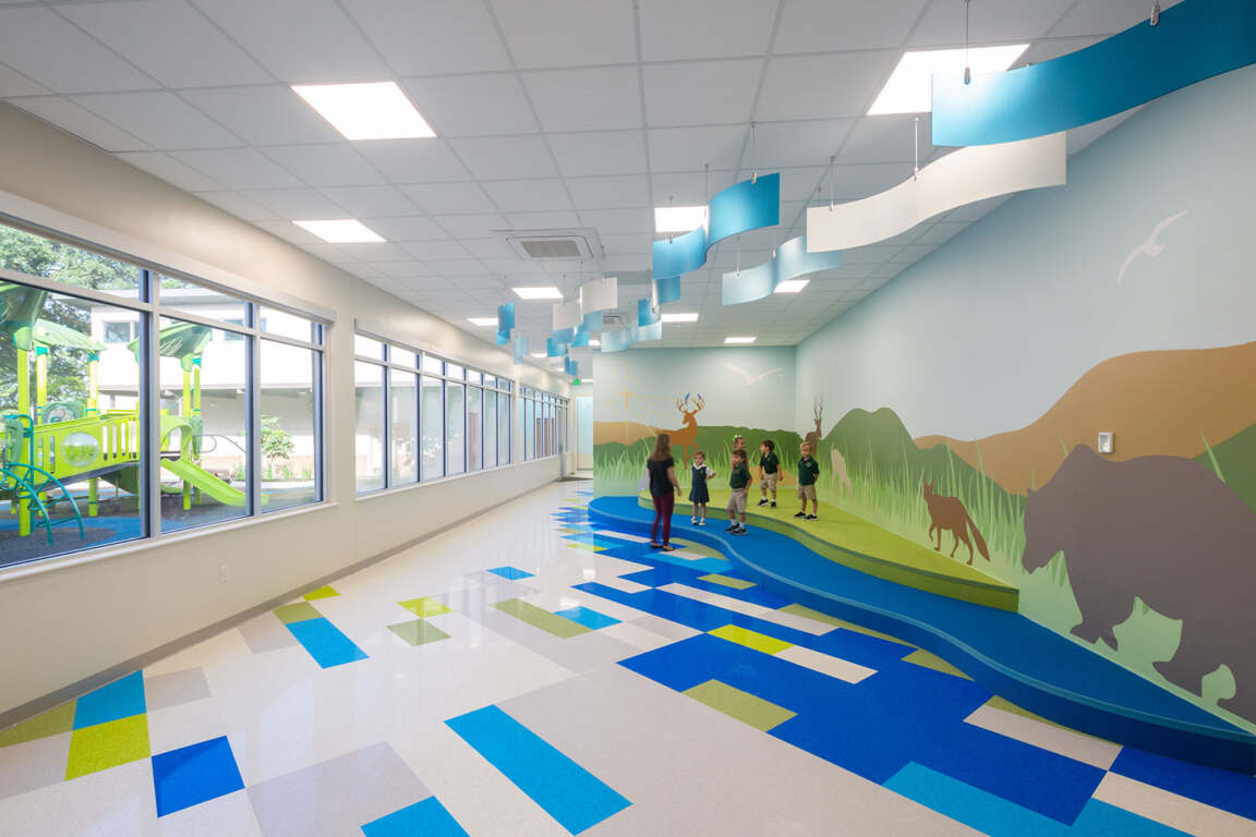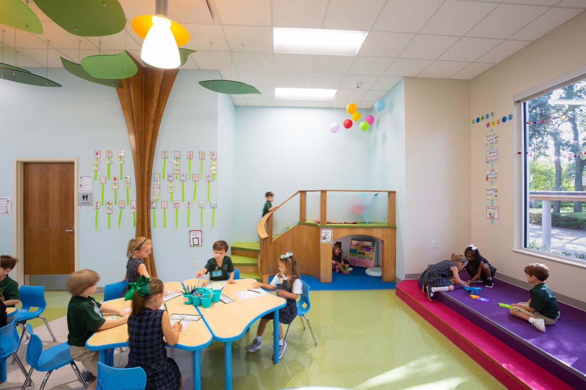 St. George Catholic Early Learning Center houses five pre-K classrooms along with several multi-functional spaces. Incorporating 21st-century design concepts for a new generation of learners, the school is bright, colorful, stimulating, and engaging.