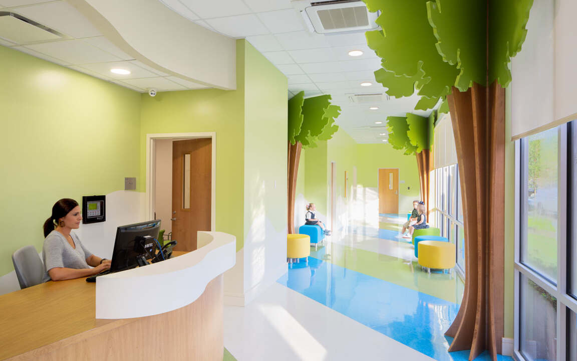 Circulation spaces double as gathering areas and showcase children’s art. Meandering walls are lined with woodland-inspired graphics and bench seating.