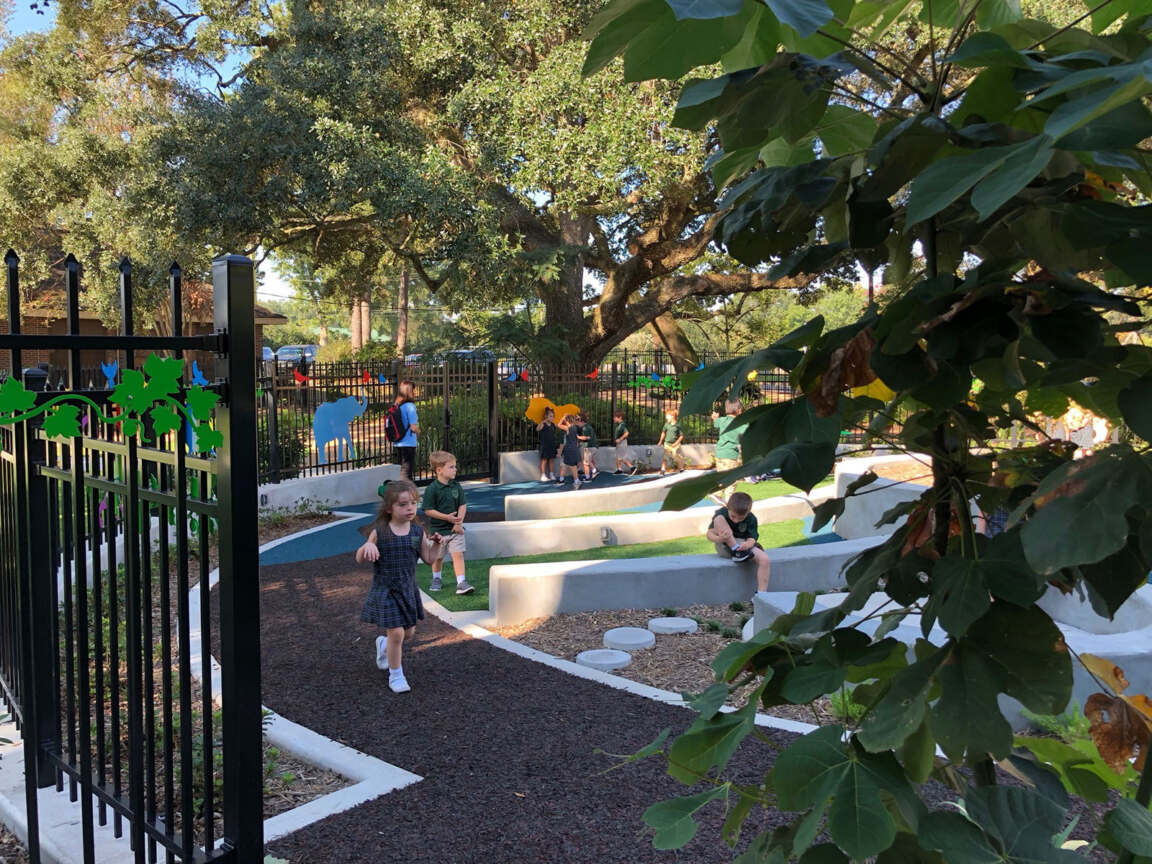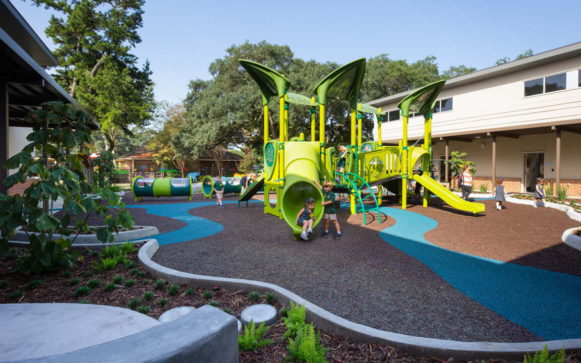 The outdoor play area encourages exploration and discovery through a variety of textures and equipment as well as lush foliage.