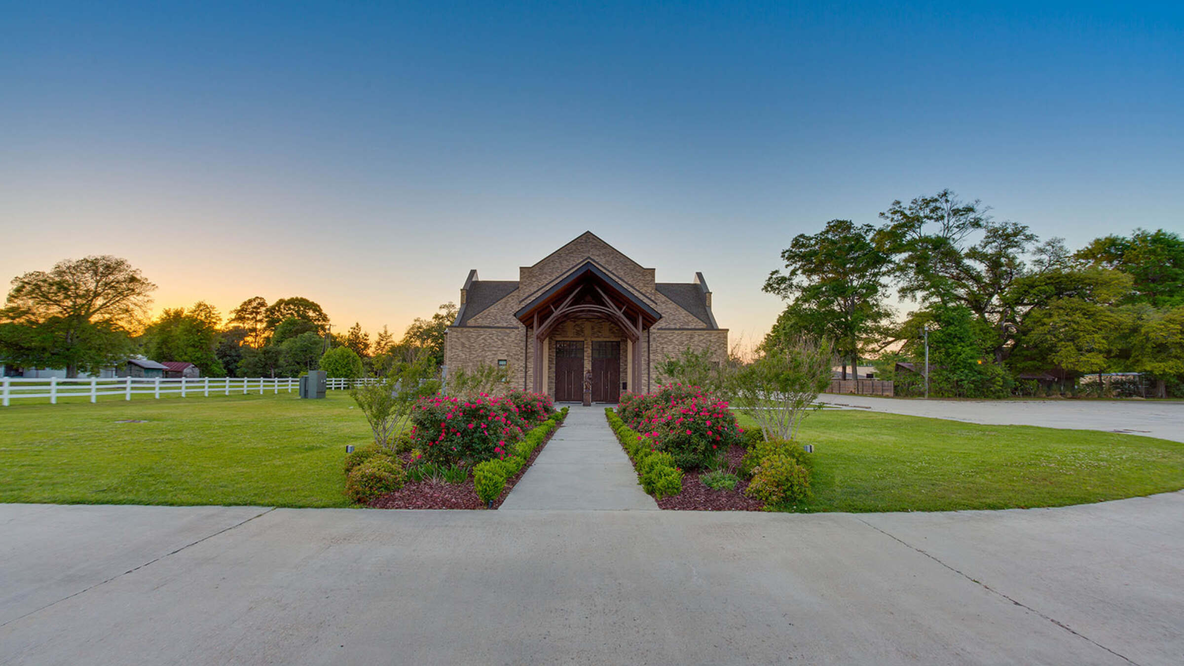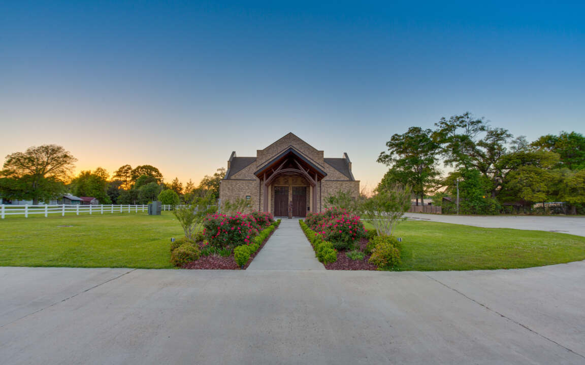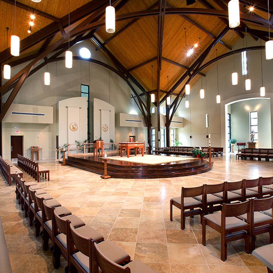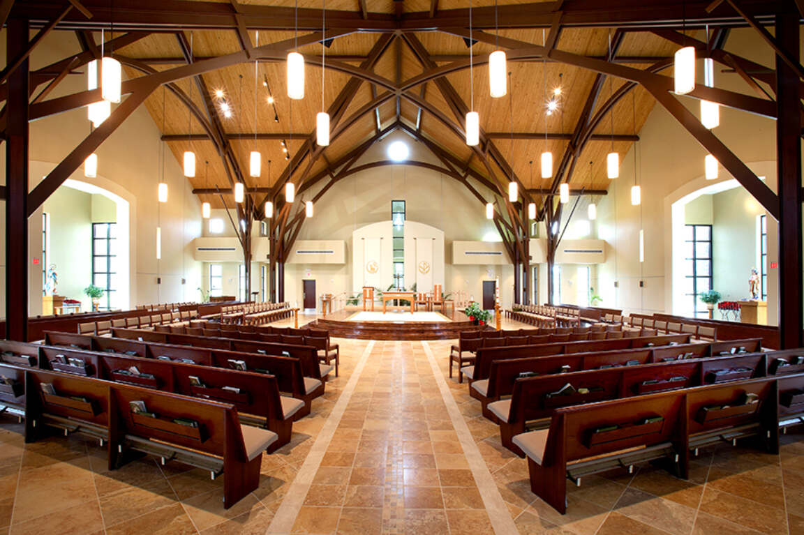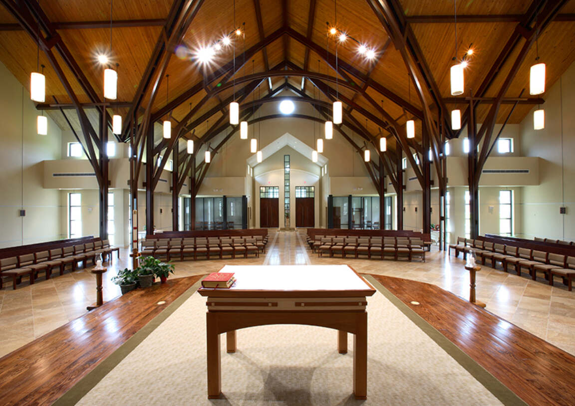The 10,515-square-foot church was designed with the altar at the center and seating on three sides. The daily Mass chapel is located on the main axis of the church and is separated from the altar platform by a full-height decorative wall, which holds banners for seasonal display.