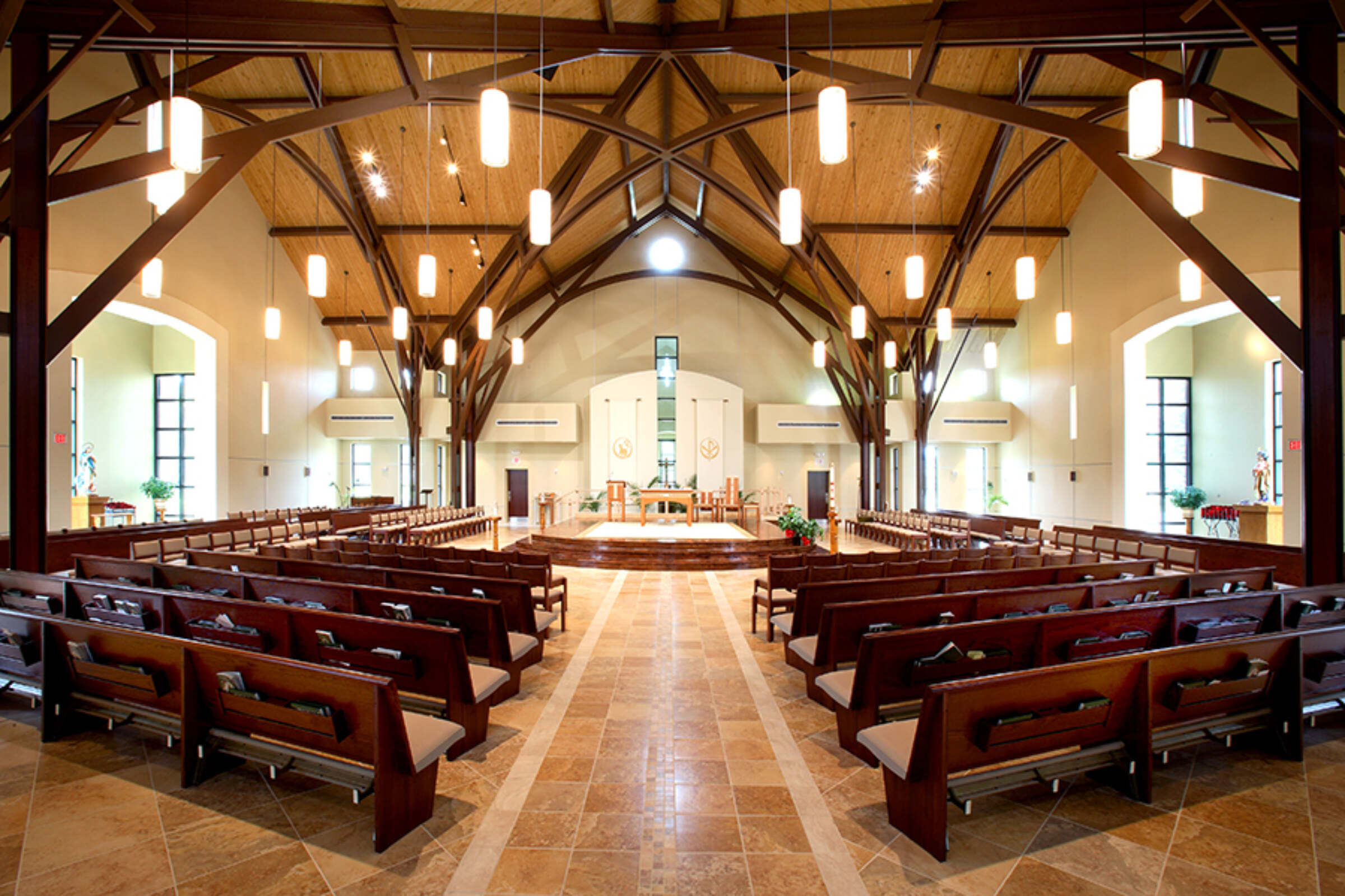 When three small parishes came together as one new church community, the union necessitated a new home church. Our firm developed a scaled cathedral design that delicately assimilates fresh contemporary elements into an otherwise customary Catholic place of worship, offering congregants an inviting and welcoming setting in which to gather. The space features a wood ceiling, soaring arched beams and a pleasant neutral palette. Natural daylight and a series of hanging light fixtures give the sanctuary a warm glow.