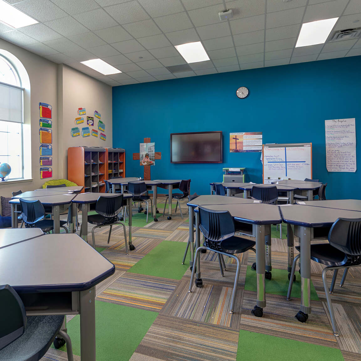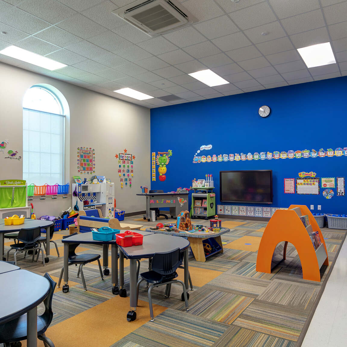 The private school campus features a chapel and a classroom building catering to students from pre-kindergarten through 6th grade. The educational building is designed with a pod concept, comprising a central foyer, administration area, support spaces, restrooms, and eight classrooms on each end of the wings. The thoughtful layout ensures a collaborative learning environment. Moreover, the design is forward-thinking, allowing for flexibility to accommodate future growth, with plans for an additional classroom building in the pipeline.
