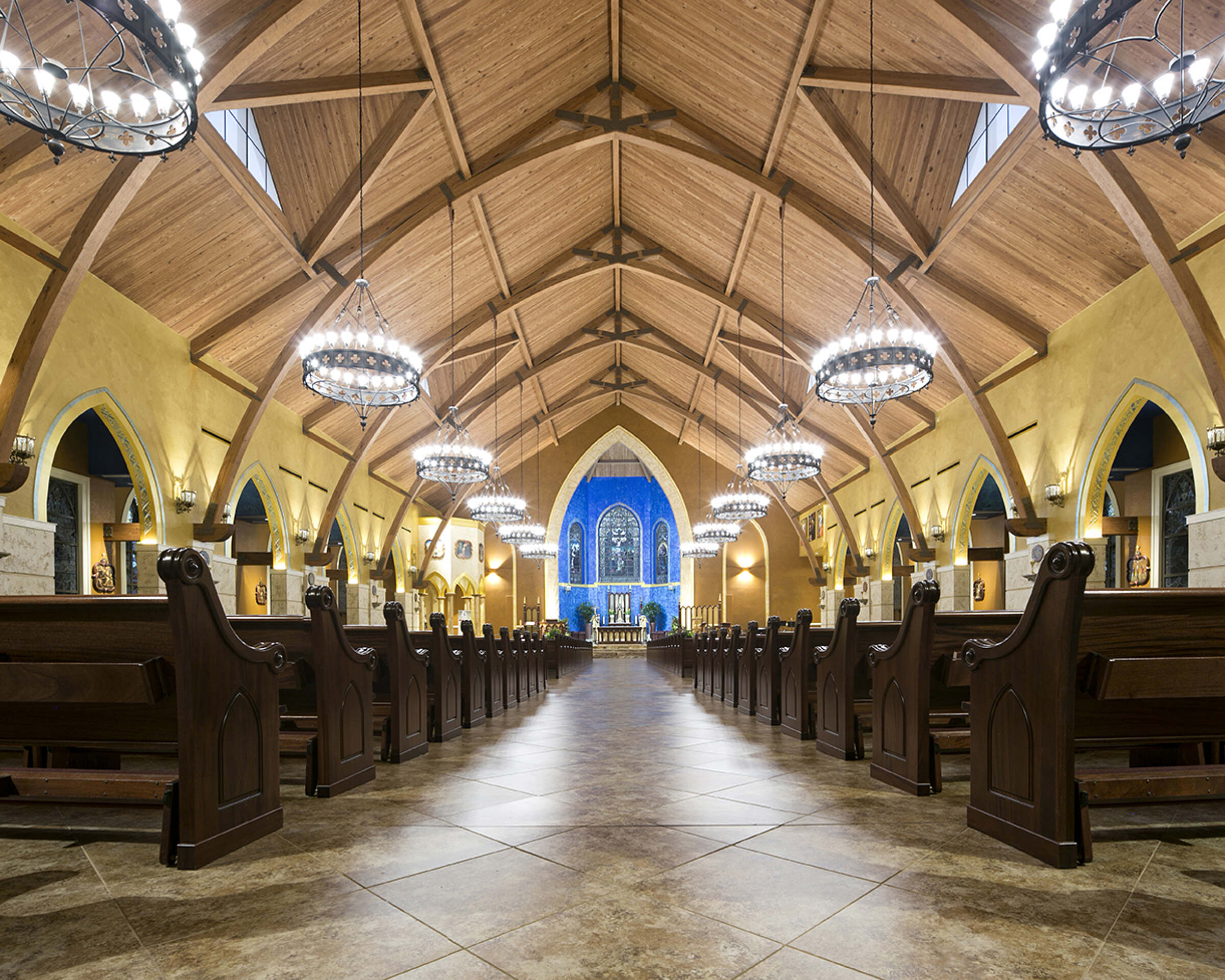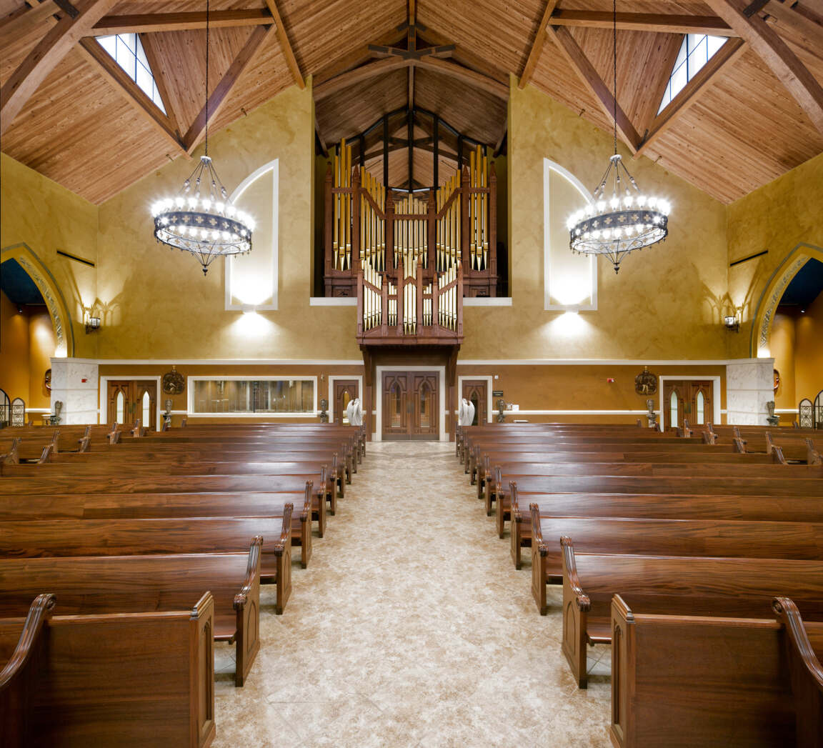The Church reflects a gothic style rich in detailing with arched wood beam and decking, veneer brick over ICF (insulated concrete form). The design features liturgical stained glass pieces acquired from around the country.