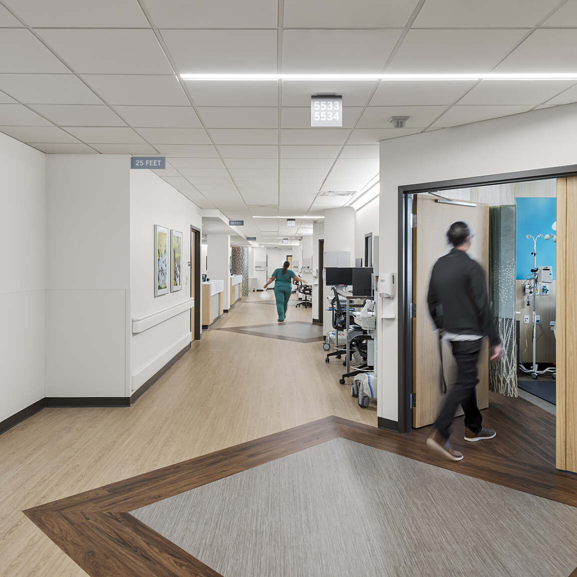 Presently in progress, a key aspect of this endeavor involves integrating Dignity Health's corporate standard signage and wayfinding into the construction. Notably, all elevator lobbies across floors one through five must align with the specific branding guidelines set forth by Dignity Health. Navigating through a triangular unit presents unique challenges in wayfinding, as conventional corridors facilitating easy navigation are absent. Ensuring seamless movement to the correct patient rooms is paramount to minimizing disruptions at the nurse station.