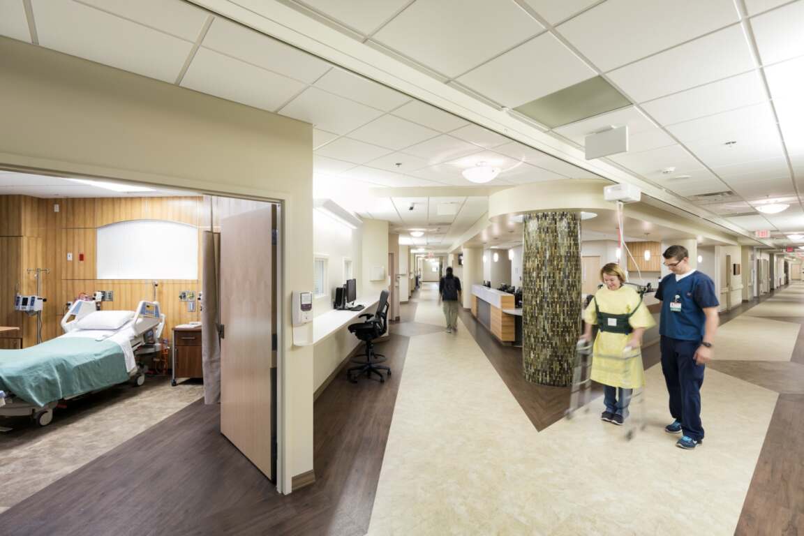 Focusing on staff efficiency, the footprint of the new tower was designed in a triangular shape to reduce walking distances for staff, maximize staff access and adjacencies to patients, and provide visual cues for orientation and location of critical functions. The triangular shape also provides a "core" area that serves as staff support space, and was designed to be flexible in order to easily adapt to future change. The concept was adapted to fit into Siena's existing hospital campus and adjoin with existing functions that needed to be remodeled.