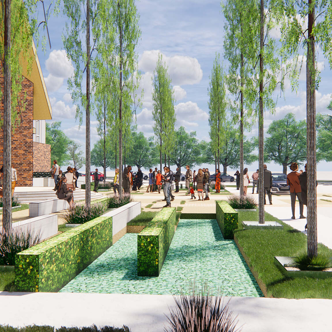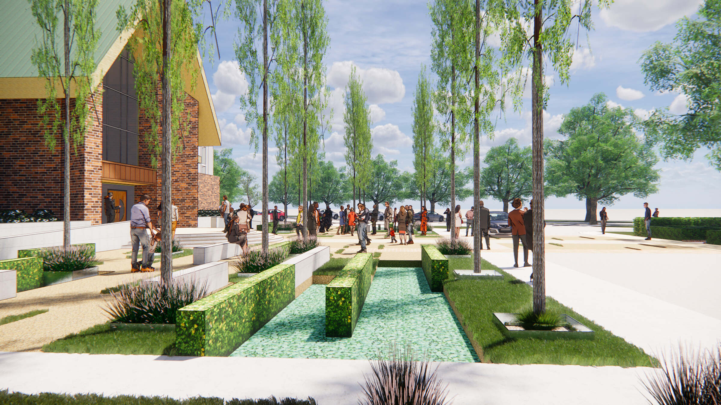 • The demolition of the existing office building, the renovation of the church plaza and the redevelopment of parking areas. This will allow for more parking directly in front of the church, provide an updated gathering space at the church entrance with seating and landscaped areas, and offer better site drainage.