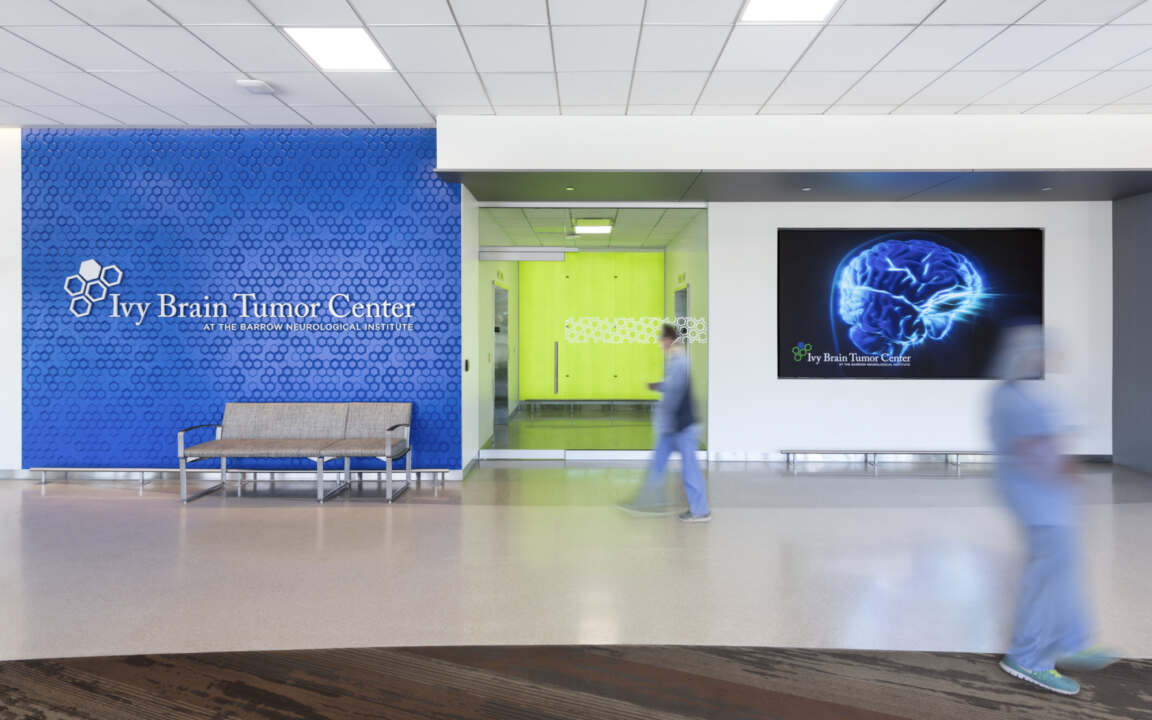 The Ben & Catherine Ivy Foundation funds brain tumor research, mainly glioblastoma, one of the most complex and deadliest cancers. Housed inside of The Barrow Neurological Institute’s St. Joseph’s campus, IBTC needed a more prominent entrance to match its prestige. The new entrance not only is designed to communicate the brand and identity of the wing but also shows the work that is being done. The design team worked with 3form to create the blue and green branded walls and used a large media wall to inform the public about the great work that’s being done at the Ivy Brain Tumor Center. All new finishes were redone throughout to maximize the impact of such a small space.