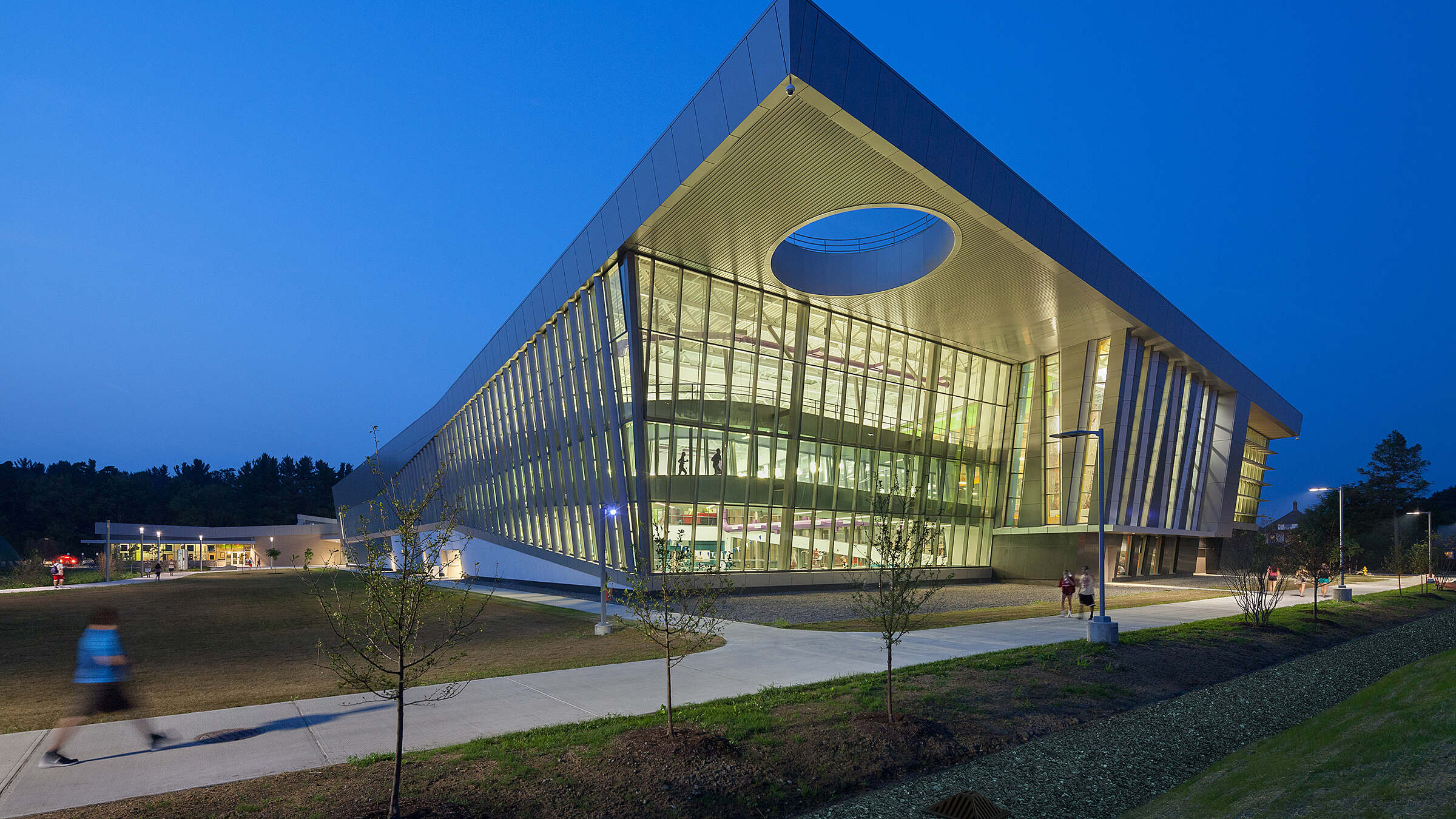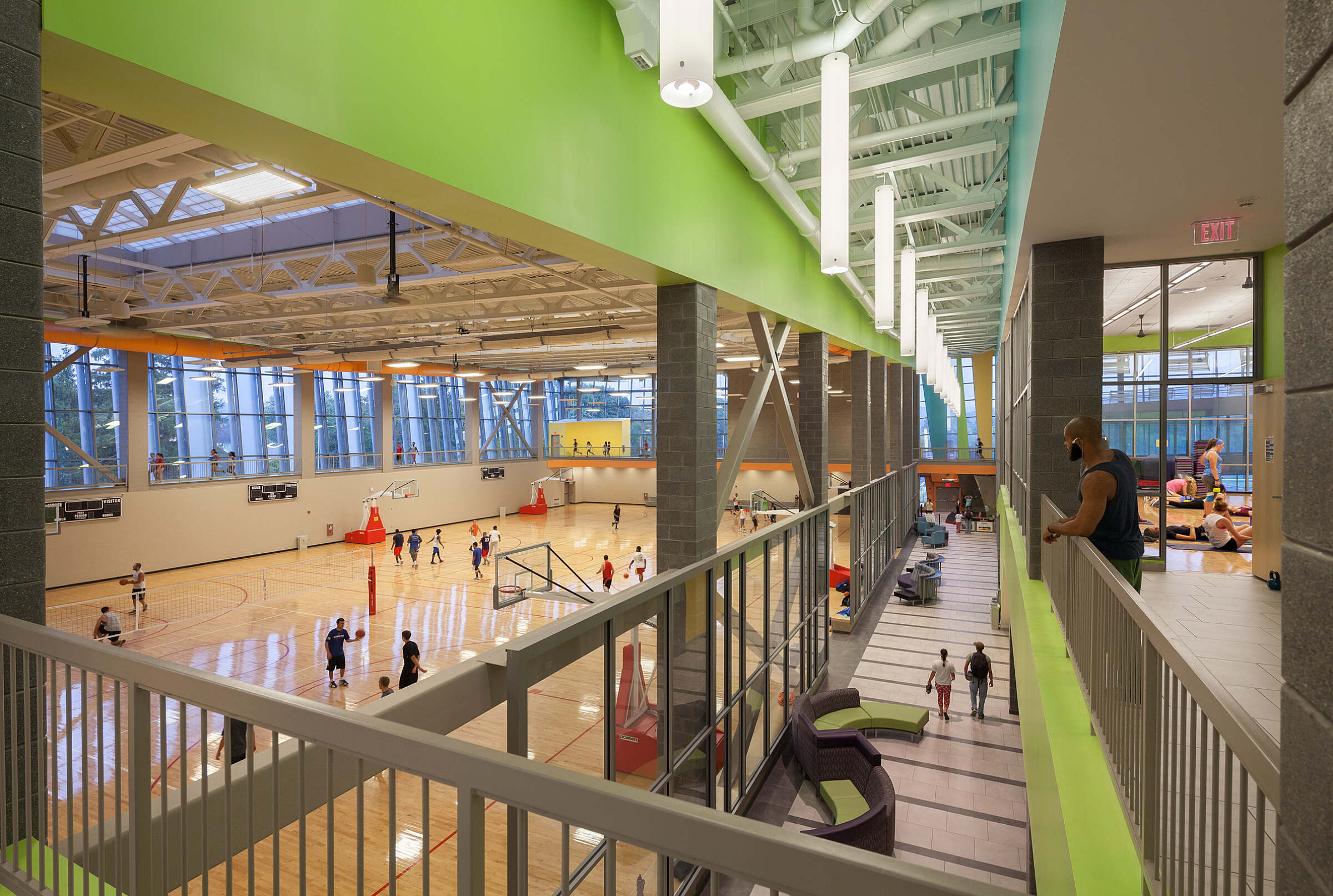 The north wing of the building houses the food service area, the Outdoor Pursuits program, and a retail store, while the south wing is dedicated to student recreation space and administrative offices. A central concourse runs through the building, connecting the two wings and leading directly to the two-level fitness center, swimming pool, gymnasium, and multi-purpose spaces. A monumental stair provides access to the second level, where students can enjoy a range of activities. At the end of the concourse, a 40-foot climbing wall offers an exciting challenge for students looking to push their limits.