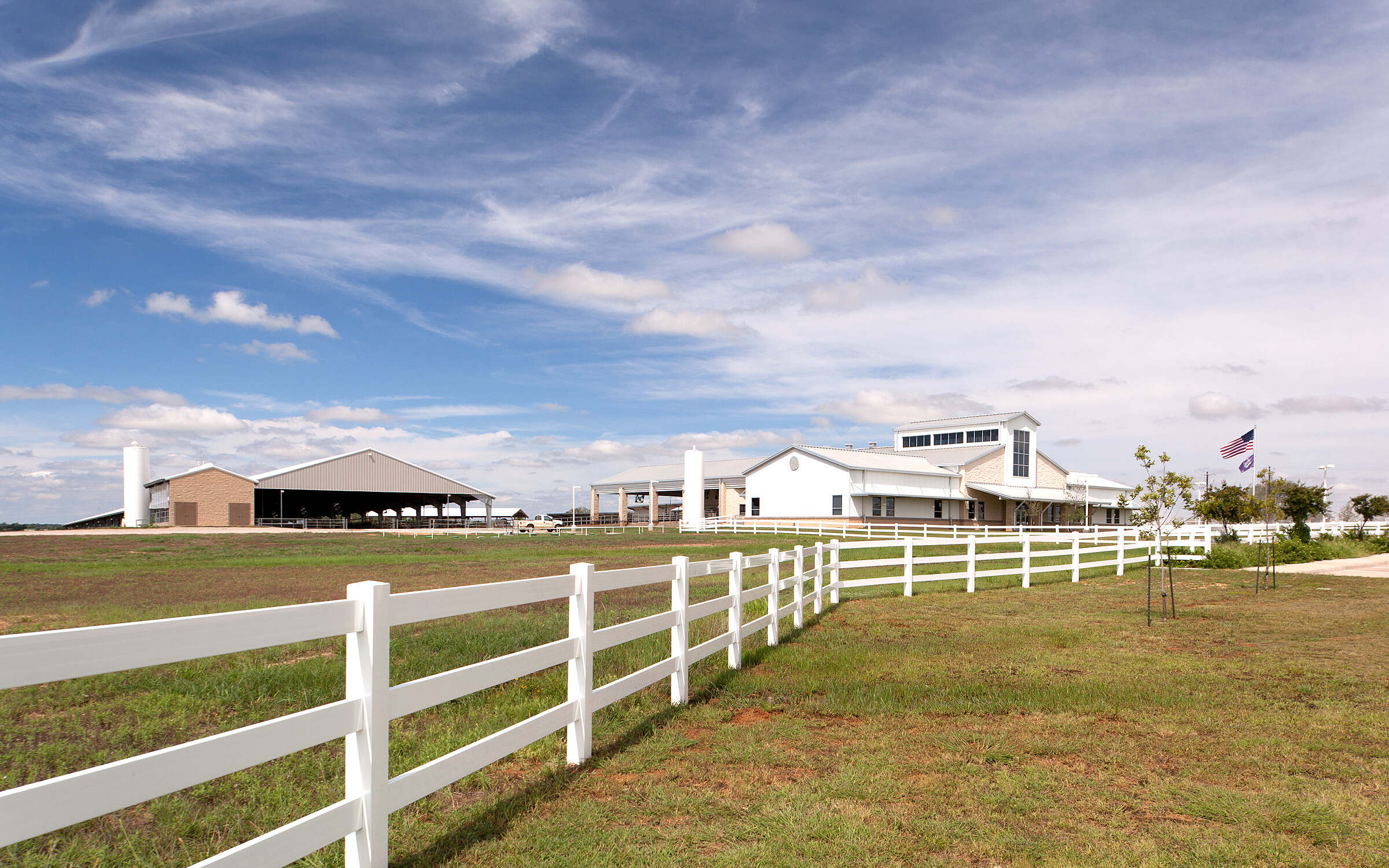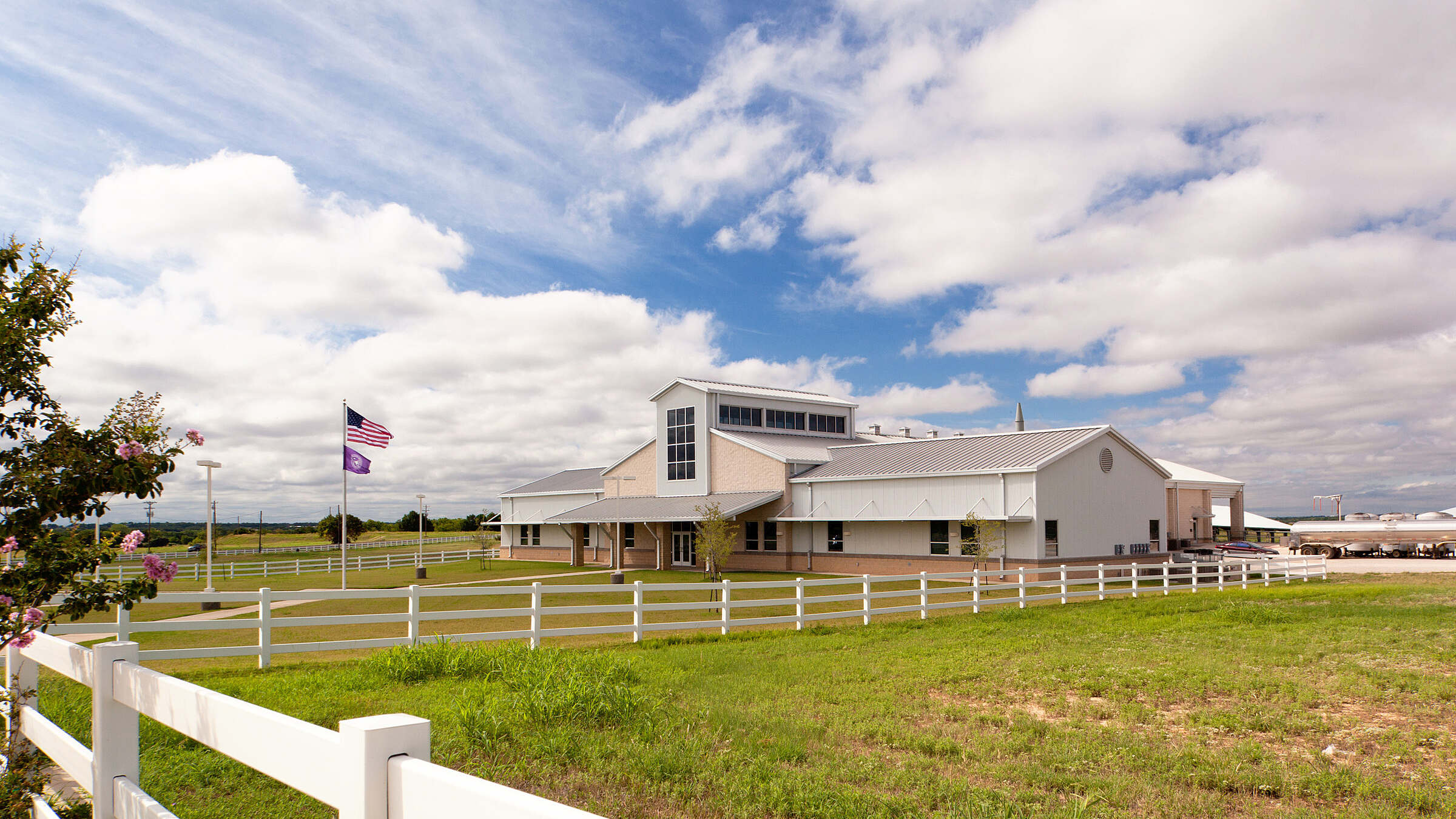 The Dairy Center and Academic Facility on Tarleton State University's campus enhances collaborative learning and research for agricultural education. Featuring classrooms, laboratories, and dairy facilities, this center facilitates production, research, and education. With a capacity to house 300 cows initially, the dairy center is designed to accommodate gradual growth as funding and resources allow. A spacious classroom/conference room provides a dedicated space for students, researchers, and observers to convene and discuss pertinent topics. The facility also includes offices, research and teaching laboratories, and a locker room for added functionality. In addition to housing barns for cattle and support facilities, the center boasts a milking parlor and a high-tech system of pens designed to streamline cattle sorting. The layout is visitor-friendly, offering opportunities for guests to learn about the dairy industry firsthand.