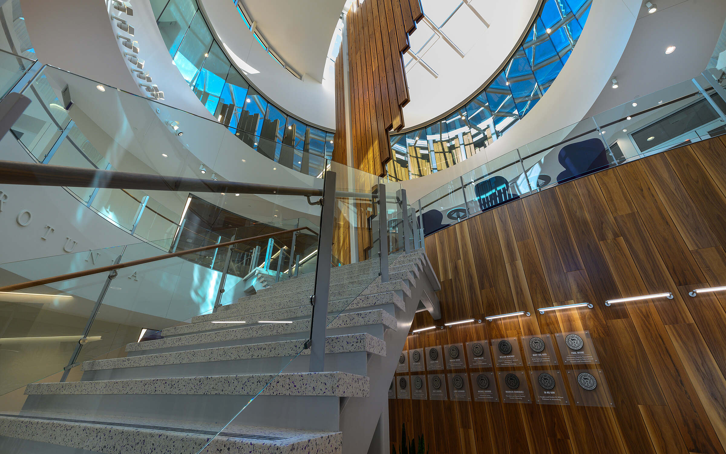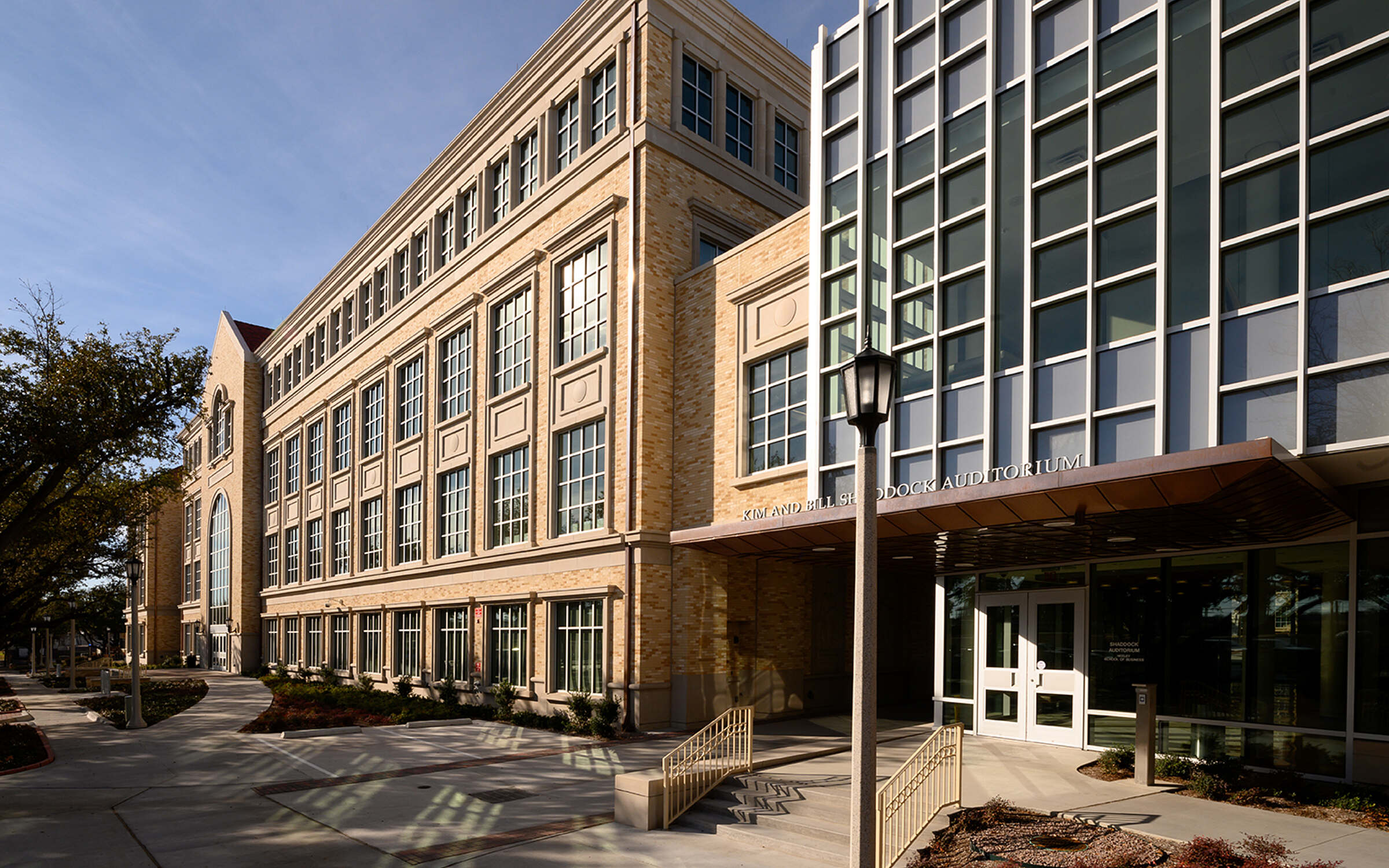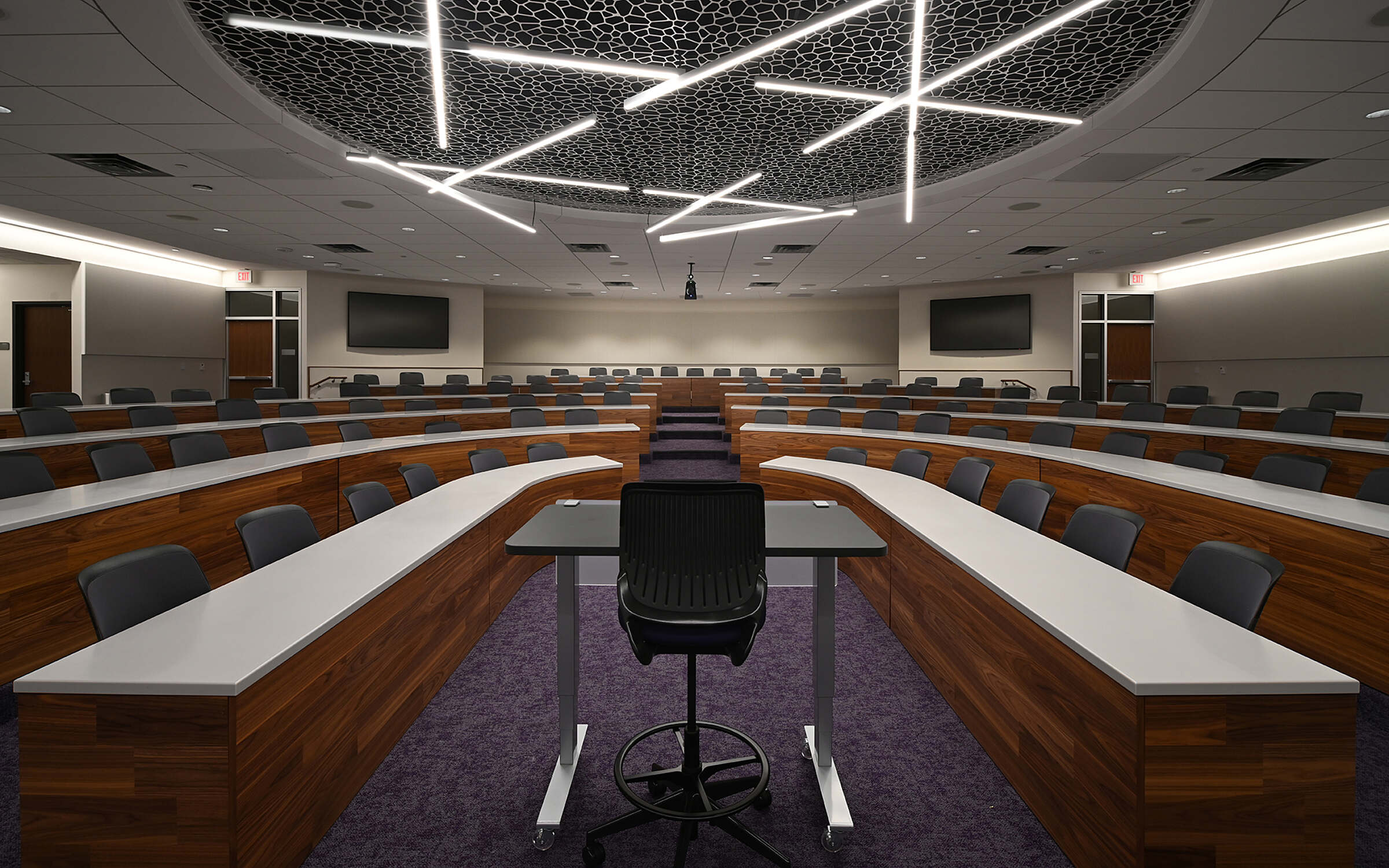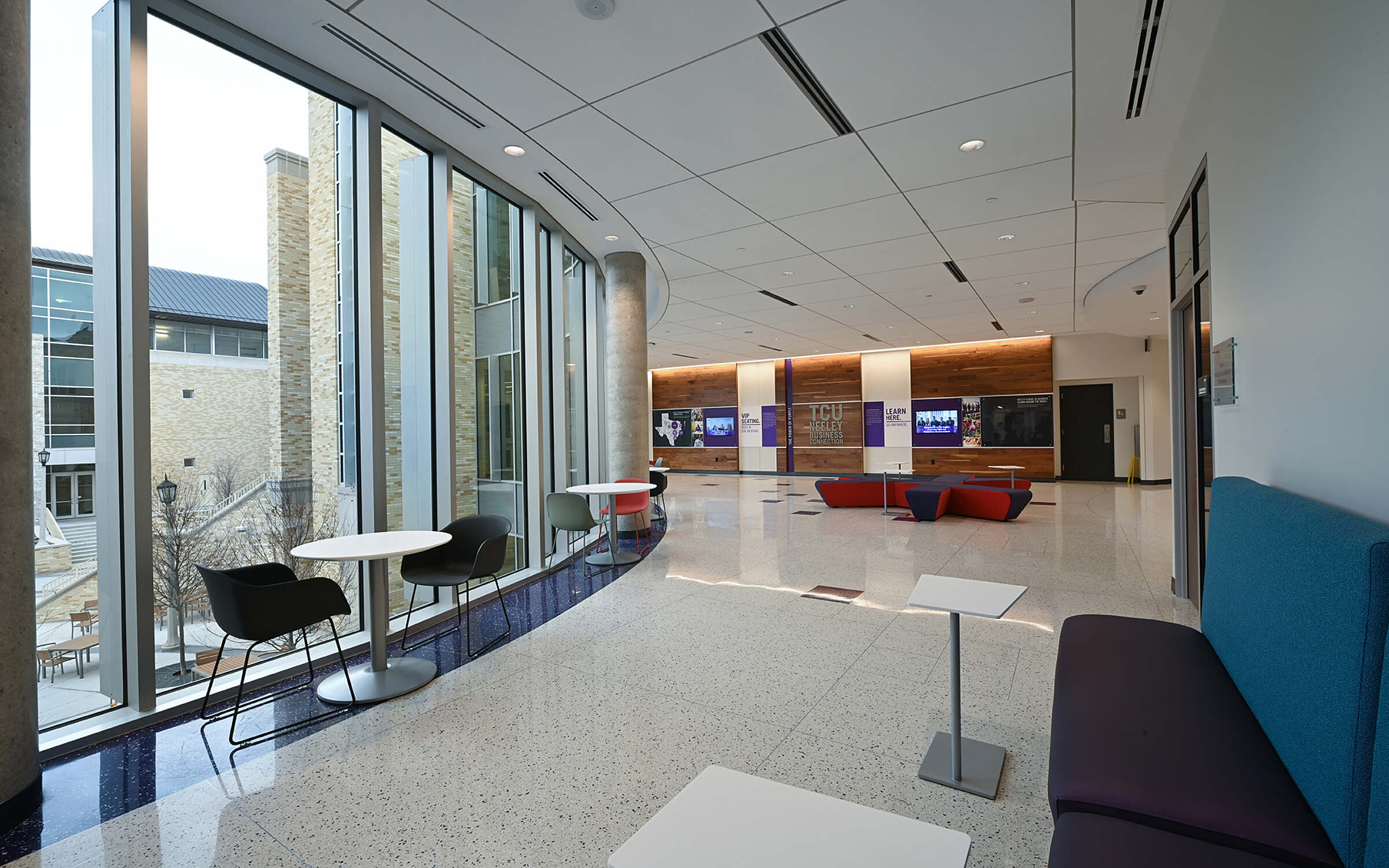 The TCU Neeley School of Business seamlessly blends forward-thinking, "Google-esque" elements with a conservative business philosophy, striking a balance between contemporary and traditional aesthetics. The design, a collaboration with CannonDesign, replaces Rogers Hall and serves as a stylistic and physical bridge connecting the modern Smith Building with the traditional architecture of the TCU campus. The facility includes a "Bloomberg room," separate recruitment facilities for graduate and undergraduate students, a cafe, banquet rooms, a 250-seat auditorium, entrepreneurship centers, behavior and sales labs, and a collaborative zone for faculty and students. A workplace strategist ensured the implementation of best practices in workplace environment strategies and planning utilization during the early planning stages. This project was done in association with CannonDesign.