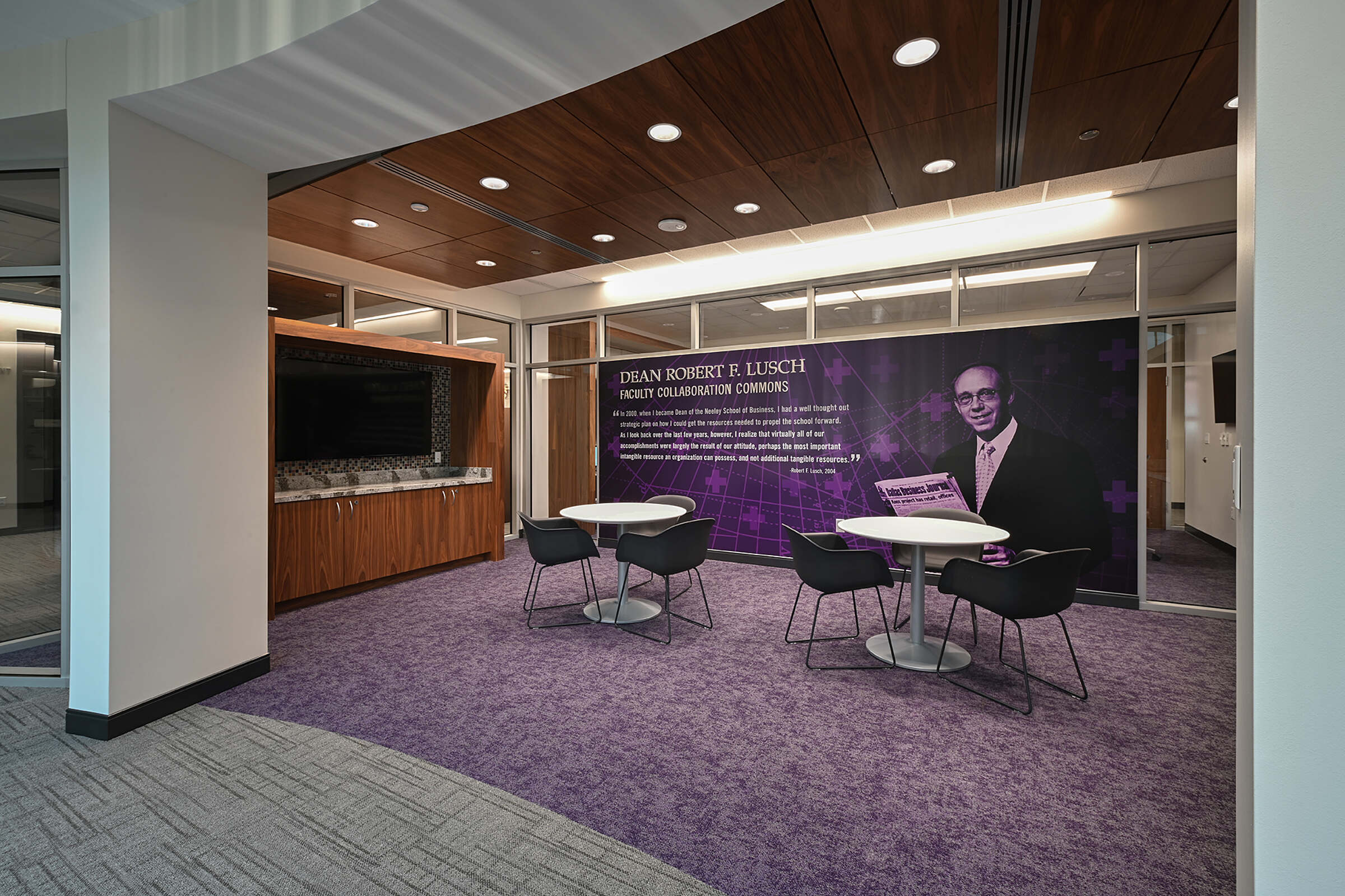The involvement of a workplace strategist during the planning stages ensured that the Neeley School of Business was not only aesthetically pleasing but also functionally optimized. This strategic input guaranteed the implementation of best practices in workplace environment strategies, ensuring that the facility's design maximized utility, comfort, and efficiency.