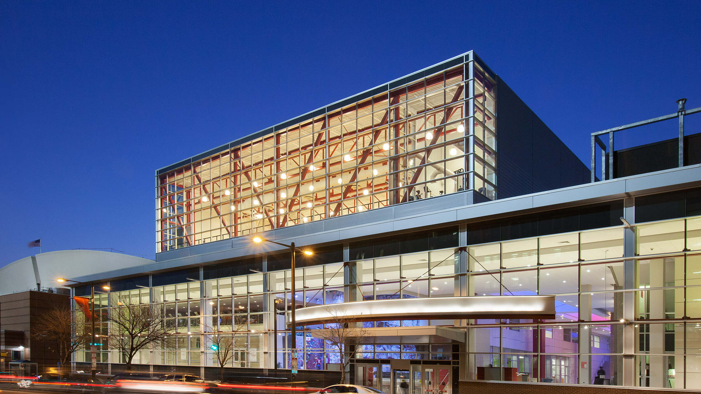 The project joined two adjacent sports and recreation facilities and transformed their concrete facades with vibrant expanses of glass wrapping the front of both buildings. Designers developed a creative solution to the site’s urban constraints: a two-story upper level constructed across the top of the two buildings.