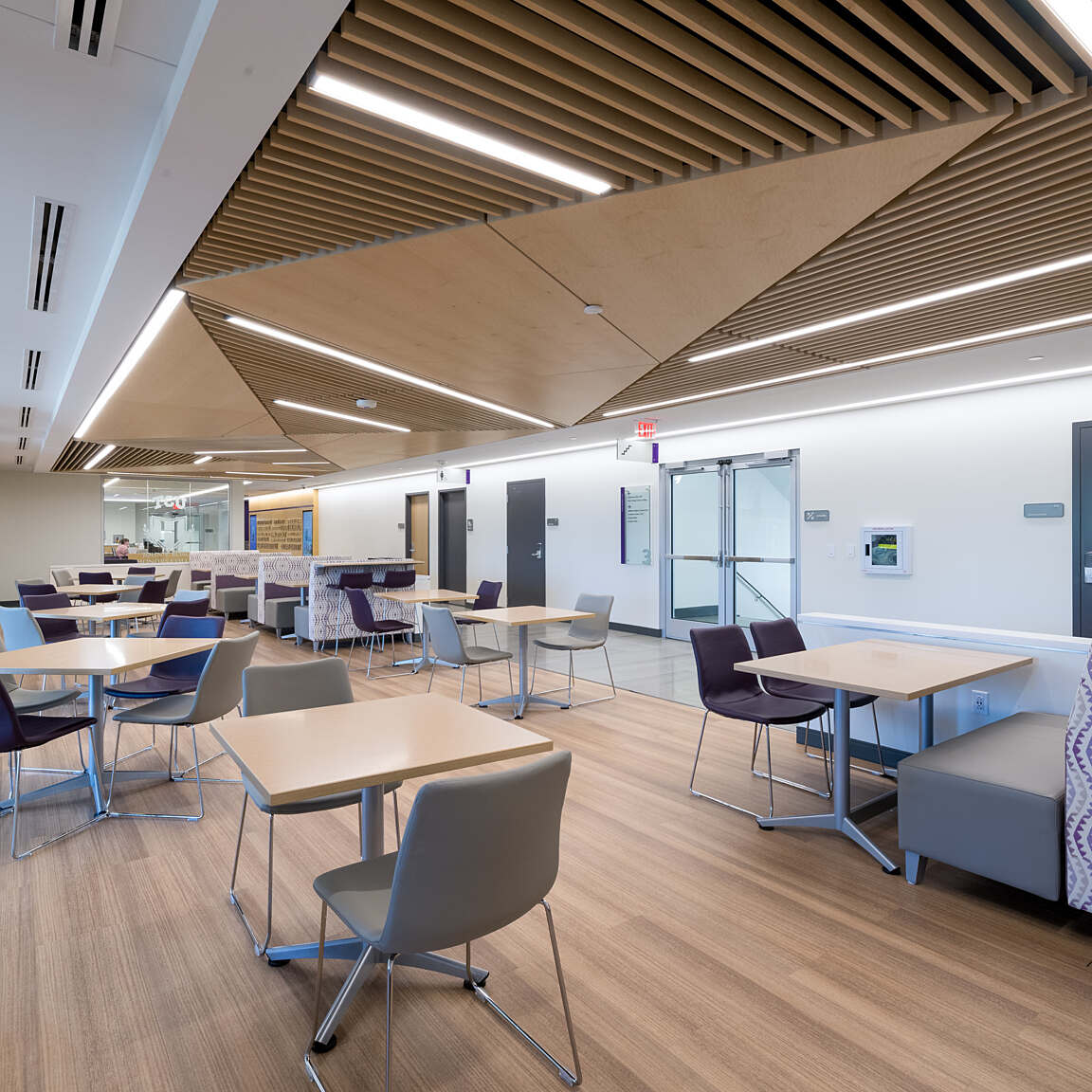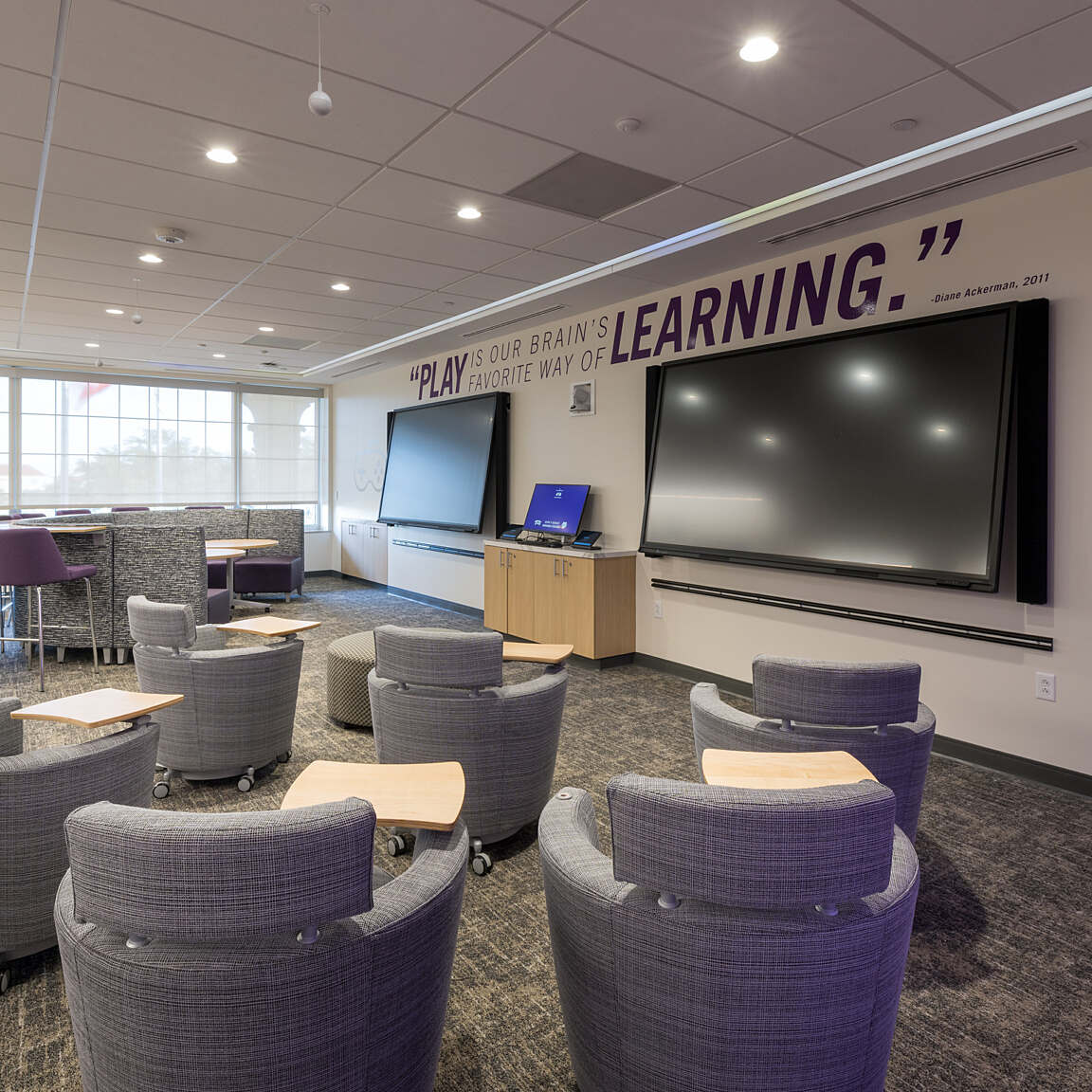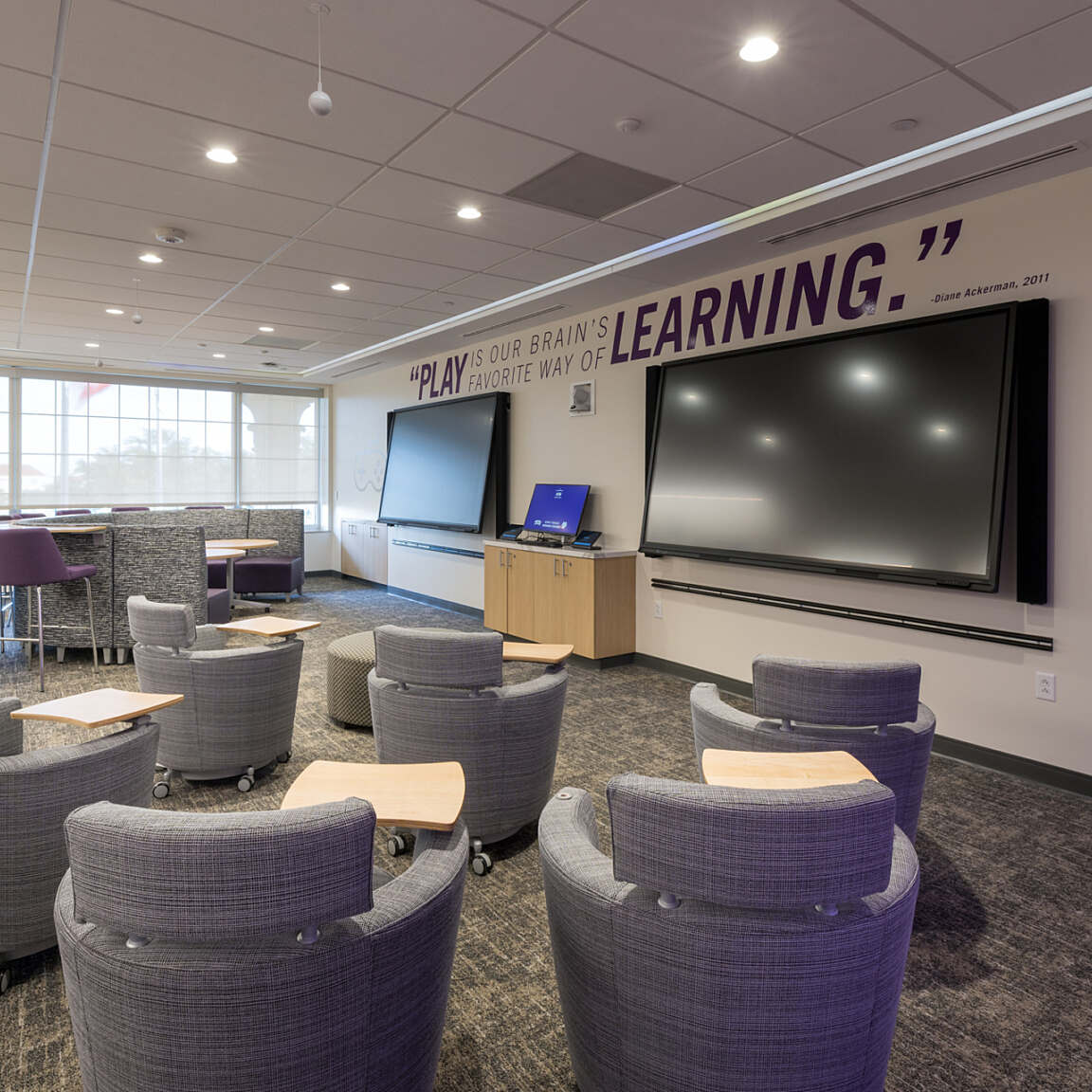 This is the renovation of 60,000 SF in a 1960s, four-story building. Sadler Hall was the original administration building, but was re-purposed to house classrooms, a student lounge, a gaming lab and faculty offices. Classroom sizes range from ten seats to 30 seats, each with extensive A/V capabilities.