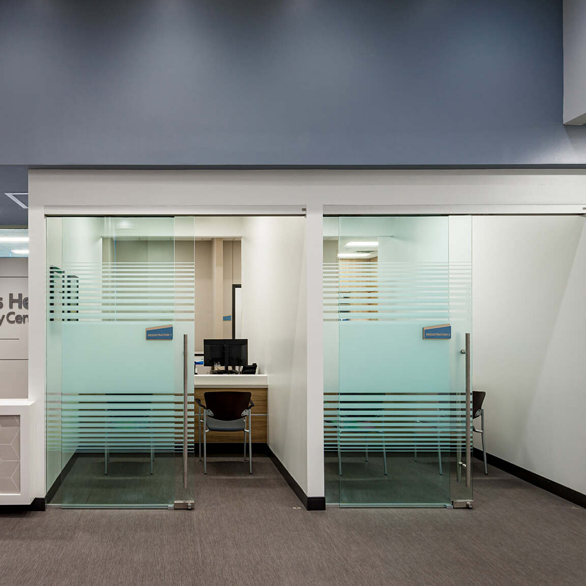The center features a dynamic drop-off canopy characterized by angled structural columns and enhanced by bold accent lighting, creating a welcoming environment for patients seeking treatment. Custom cast stone profiles were designed for the entrances and window surroundings, adding a distinctive and refined touch to the overall aesthetic.
