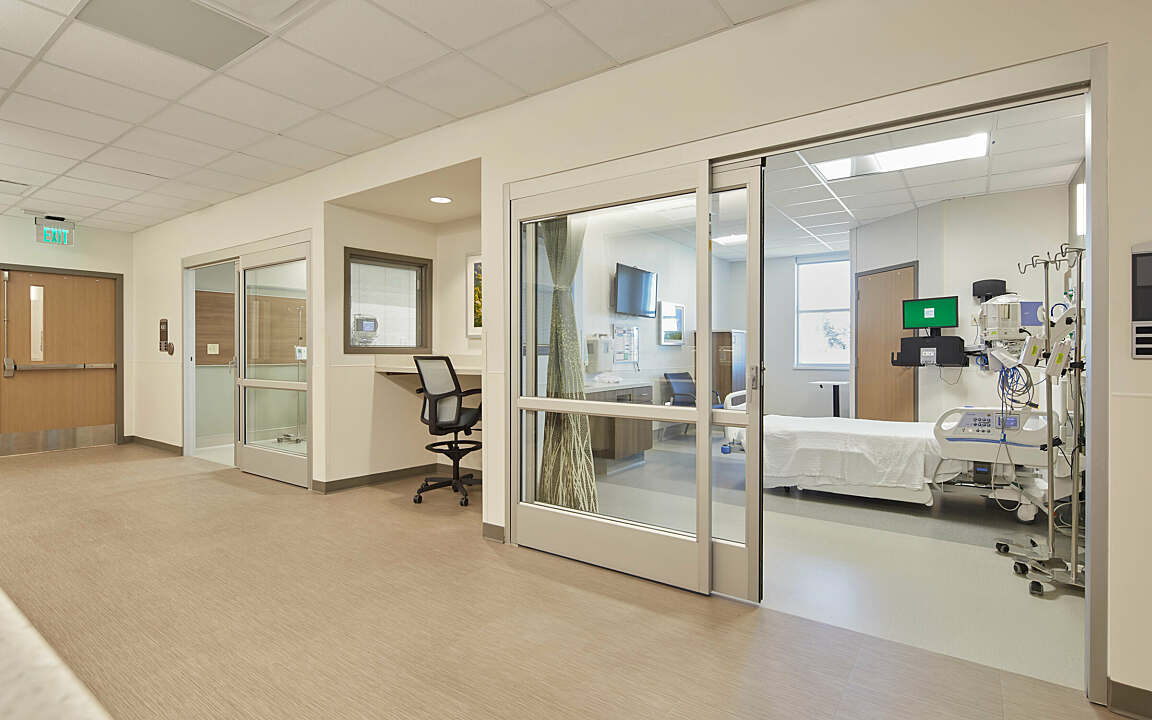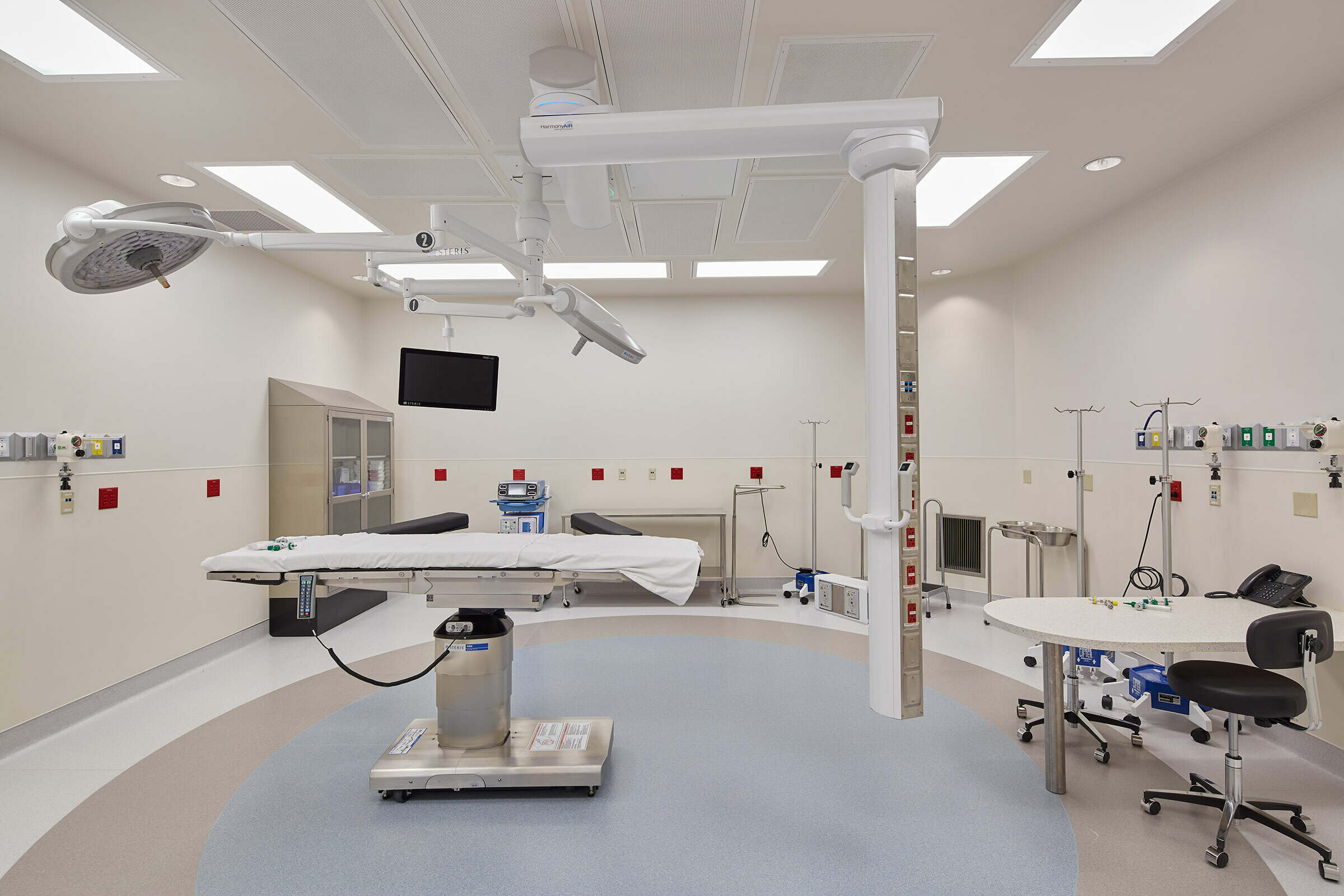 The hospital’s nursing units feature soothing color and material palettes while promoting wellness and patient privacy through family zones, nursing zones and abundant natural light.