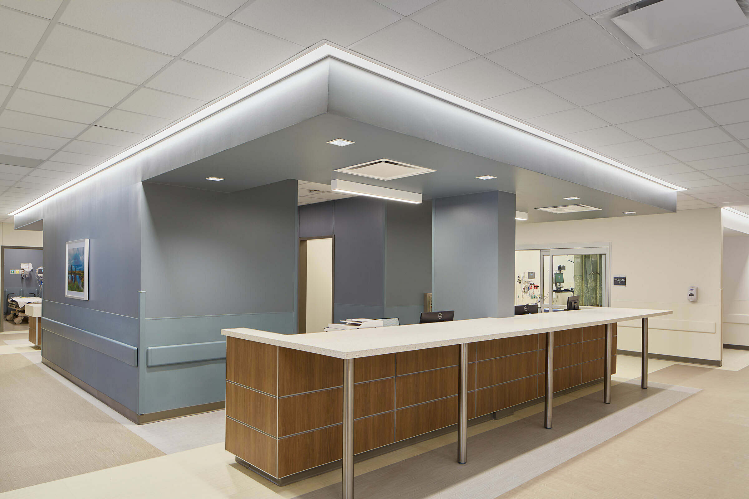 The new and improved Trinity Medical, designed by Grace, offers inpatient and outpatient services via a surgical suite, two intensive care units and an eight-room ER. Recognizing aging trends and evolving patient needs, the new facility was designed to adapt to a variety of care modalities. For example, of the hospital’s 25 beds, two are dedicated to ICU patients and three are used as “swing beds” for skilled nursing or higher acuity levels of care. The addition of a 17,000-square-foot medical office building — which houses physical therapy spaces, eight examination rooms and two procedure rooms — further increases space, capacity, efficiency and functionality while decreasing patient wait times.