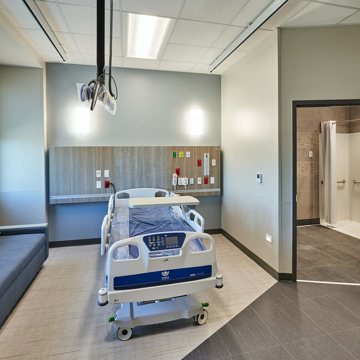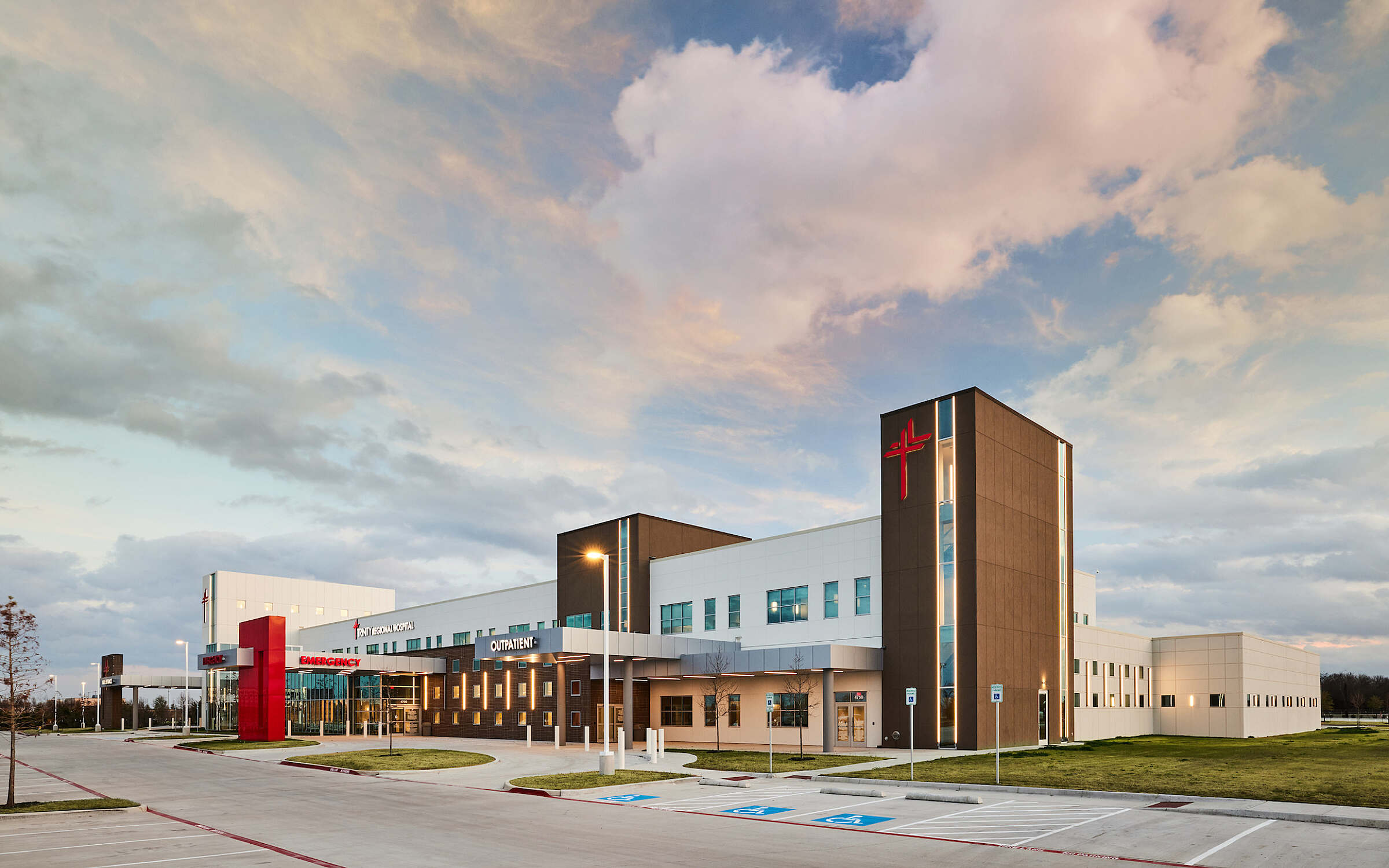 The hospital is equipped with a modern design, clean dynamic lines that include an entrance tower lobby element to provide a focal point on the campus.