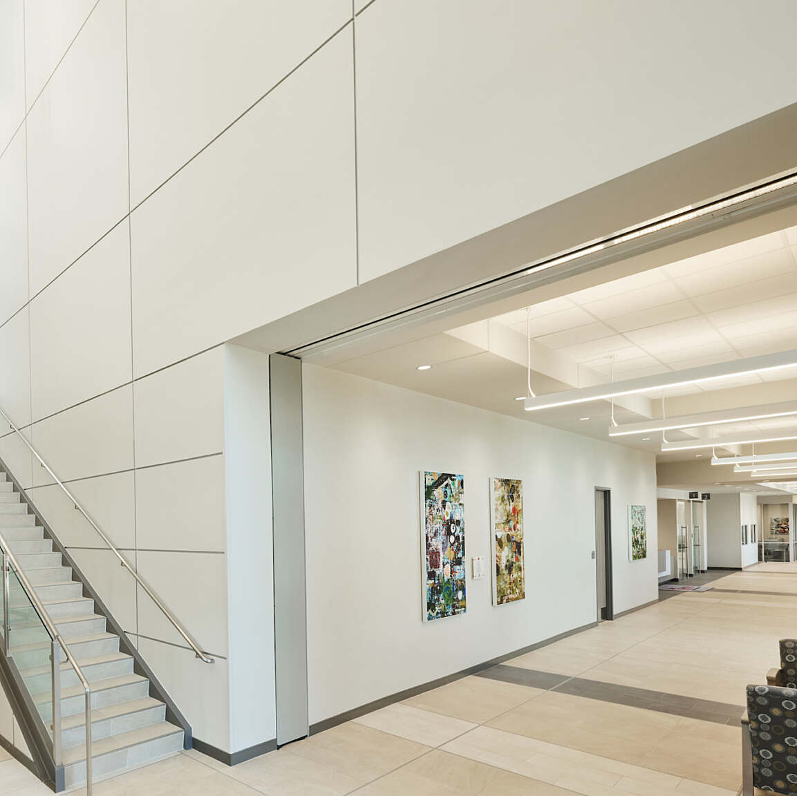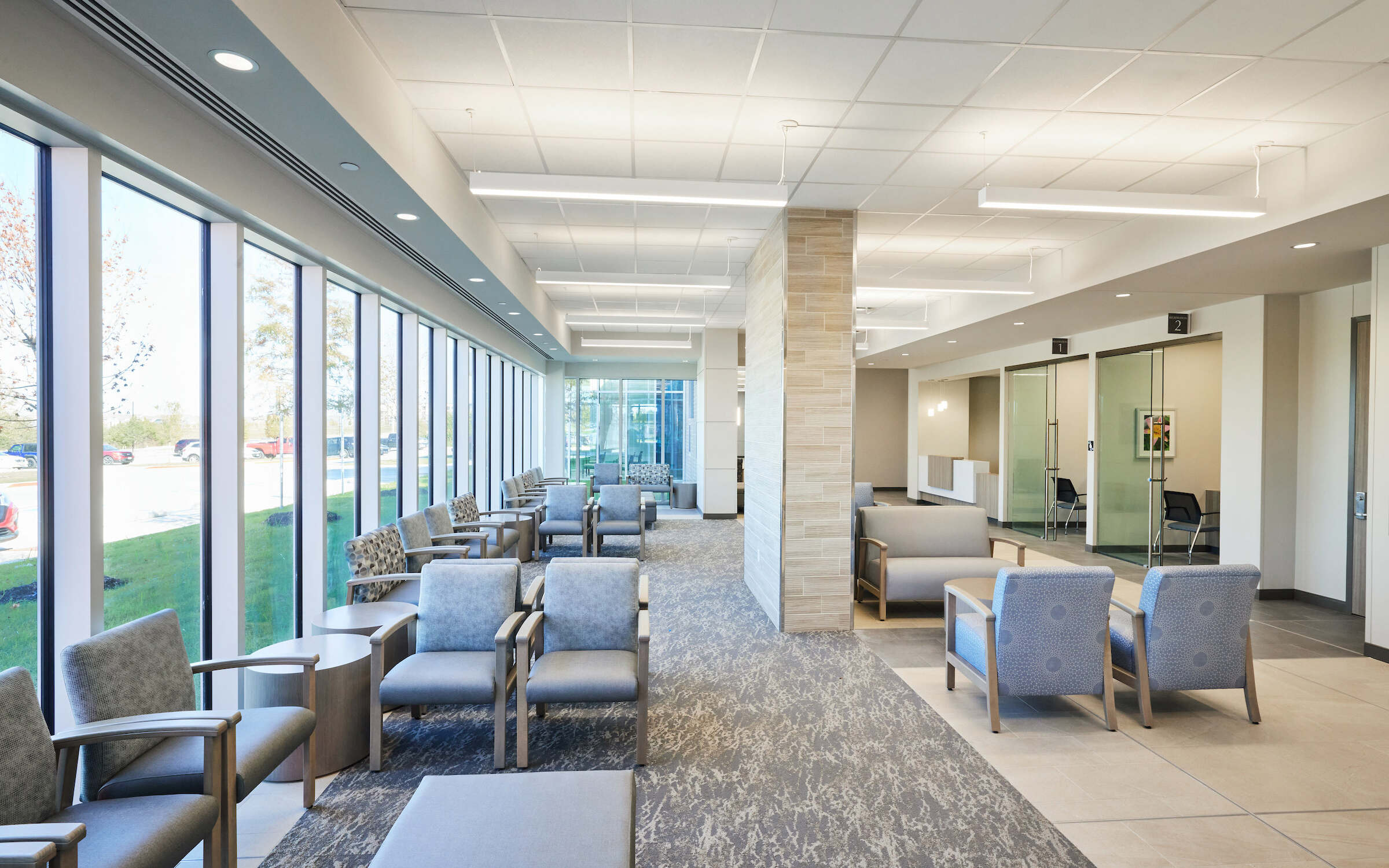 Our clean, simple design provides natural lighting throughout the facility. We incorporated a lot of glass to provide a sun lighting inside the building. Throughout different times of the day, you get spotlight moving across the floor for a calming effect.