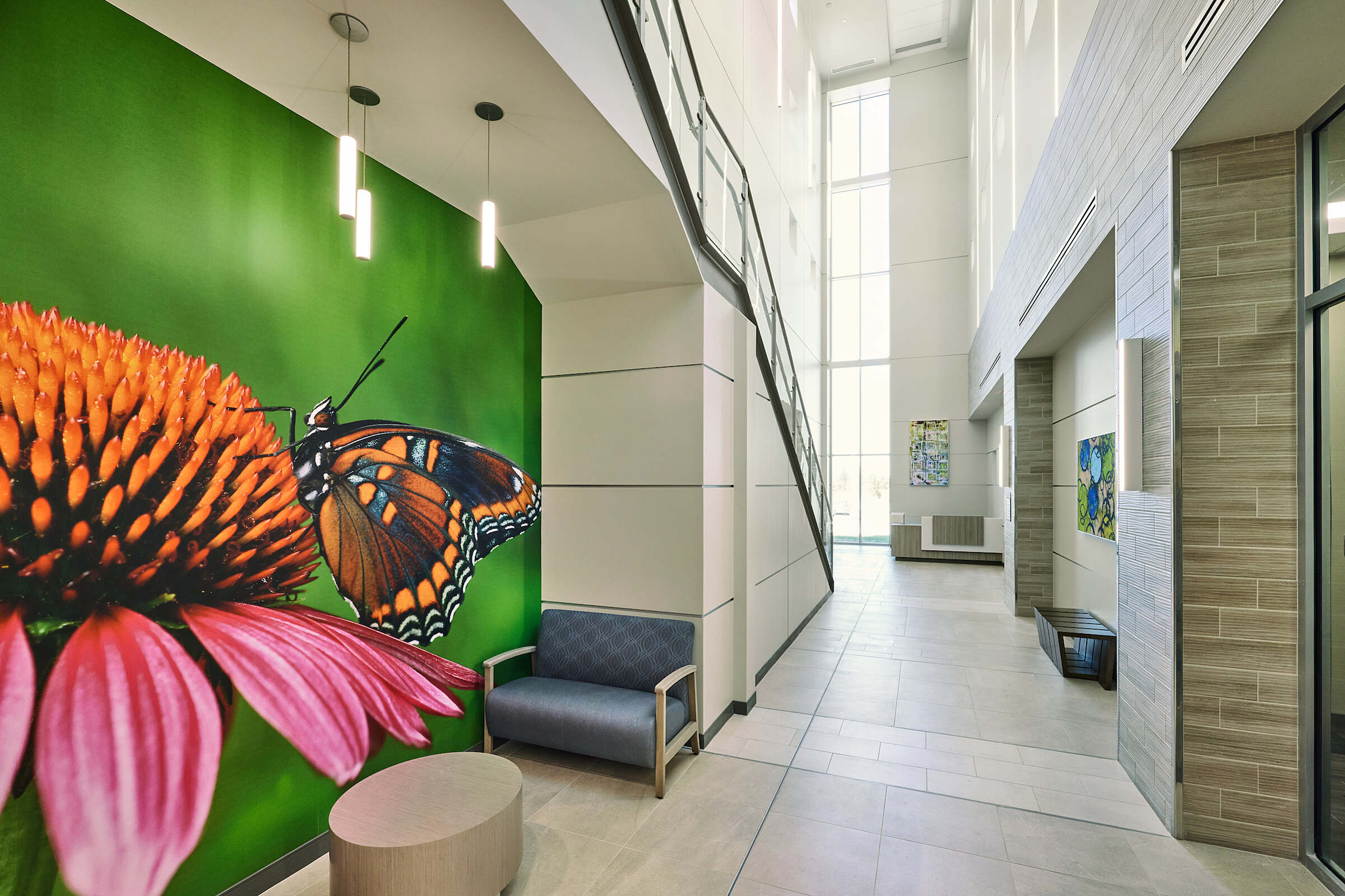 To enhance the experience for patients, the artwork package is contemporary based on the natural fauna and flora of Texas wildflowers. Each piece is in relation to the central theme through photographs, paintings, books, and watercolors.