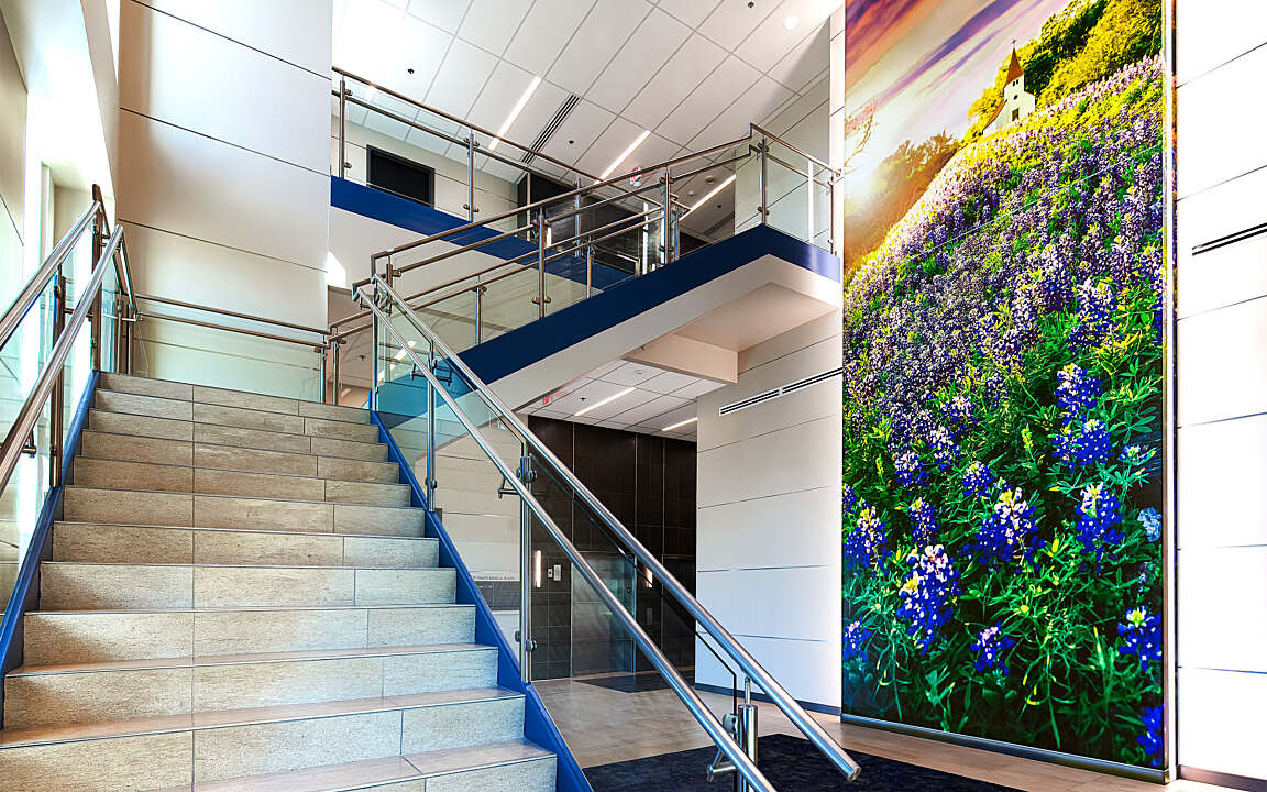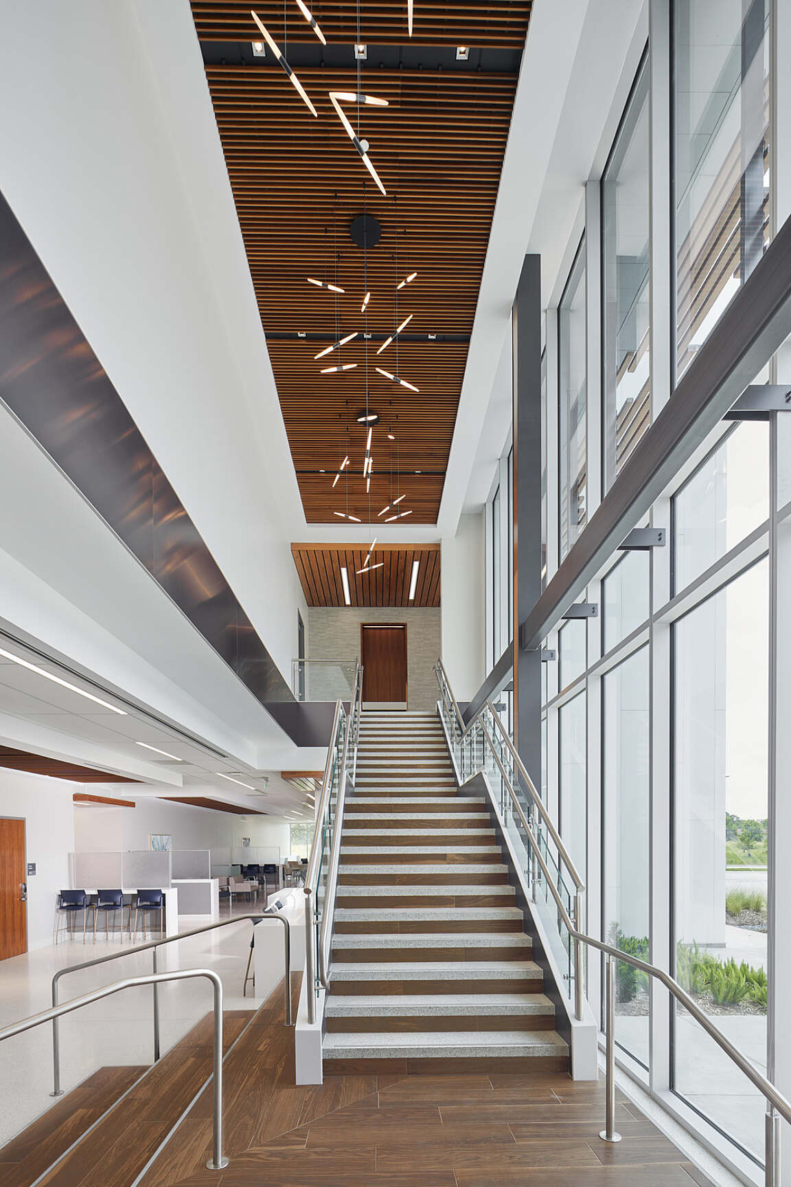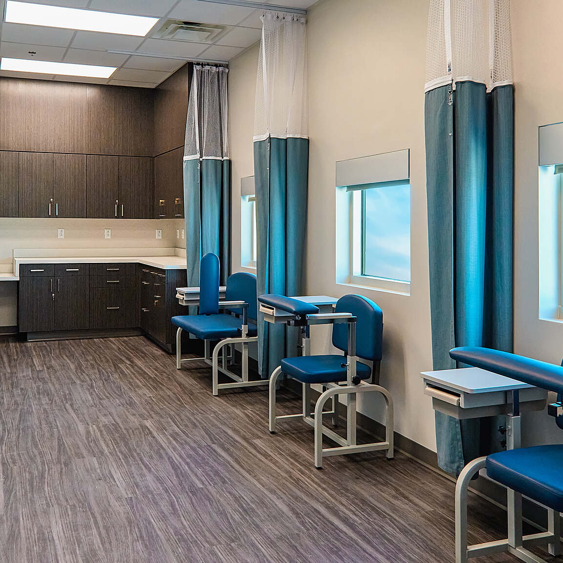 The exterior of the facility also features state-of-the-art features such as tilt wall construction, a sophisticated blend of curtain wall and metal panels, and carefully integrated exterior lighting. This harmonious fusion creates an architectural masterpiece that seamlessly aligns with the neighboring hospital, contributing to a cohesive and visually striking medical campus.