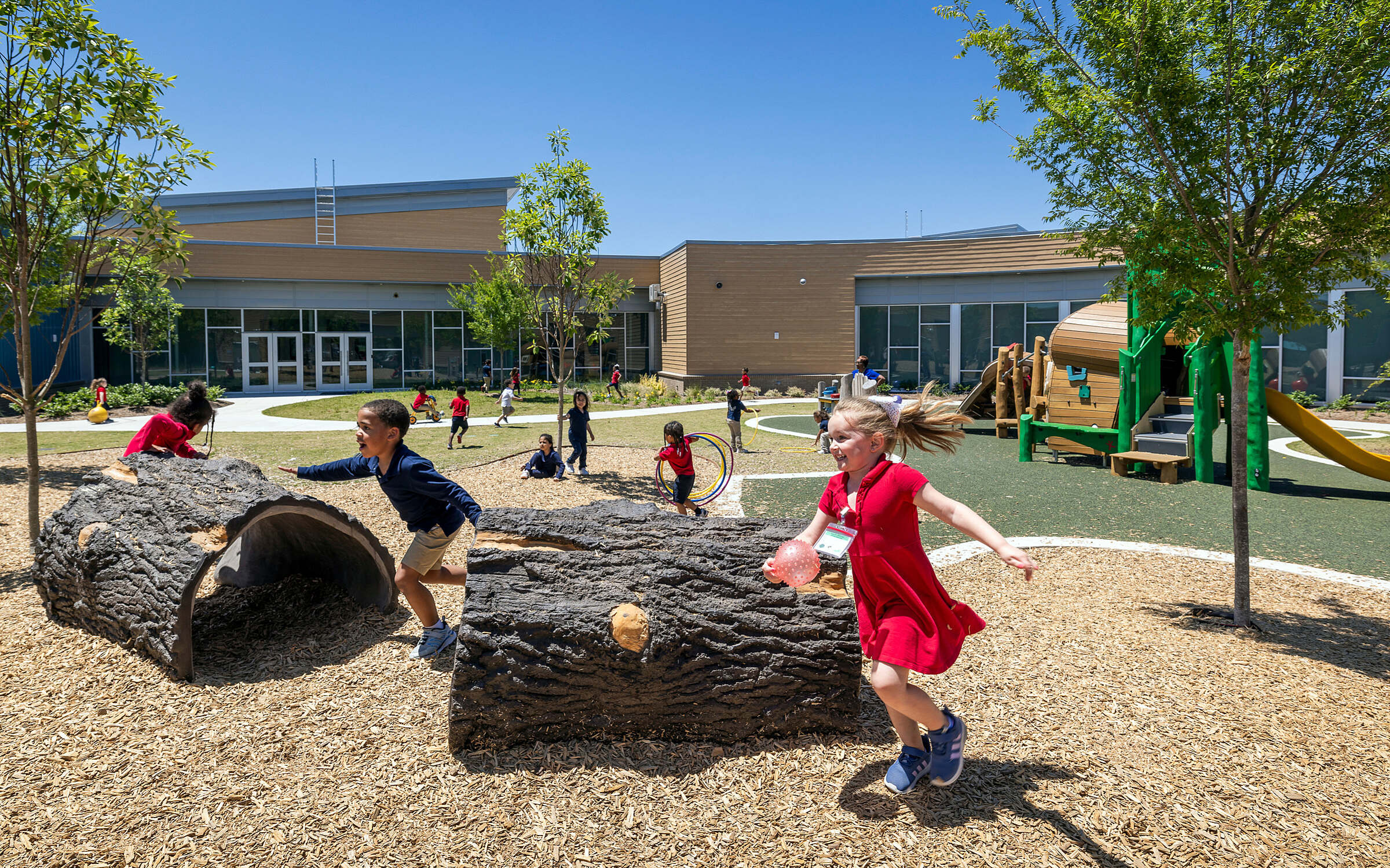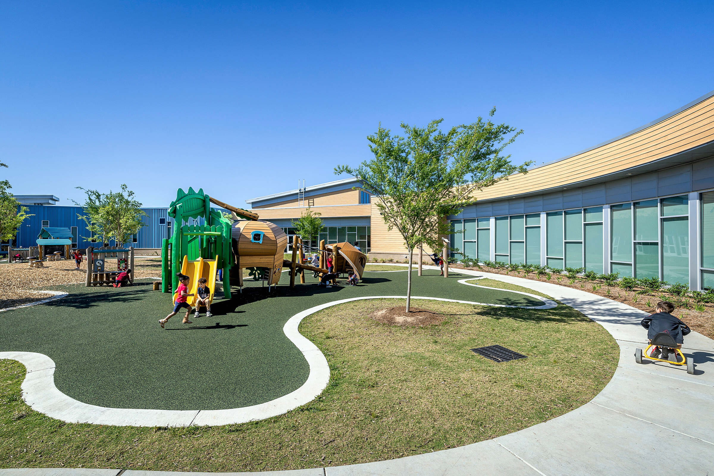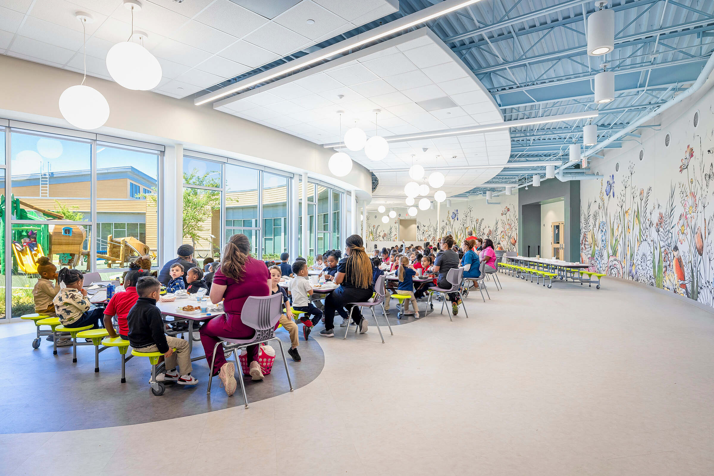 A secure playground was of upmost importance to the educators and administrators. A common theme in each group's "dream school" from the visioning sessions was a radial building organization around a central, secure play area. This design seamlessly blends outdoor and indoor learning with expansive, open windows, providing a stimulating environment for students to explore.