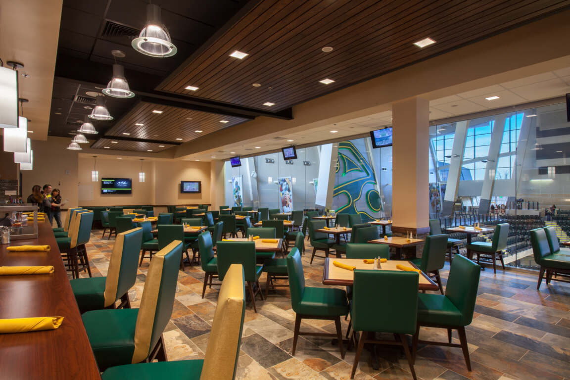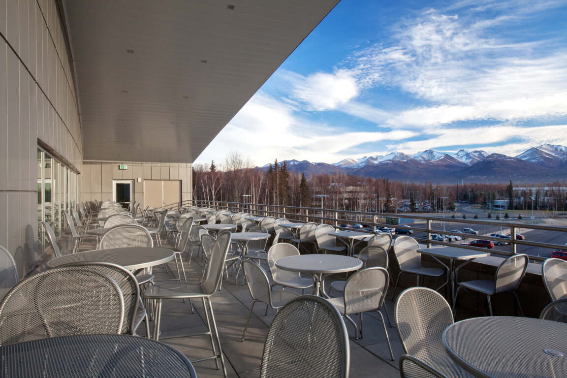 The Alaska Airlines Arena is a destination venue for concerts and family shows, and includes luxury suites and the Varsity Sports Grill restaurant. The restaurant has indoor and outdoor seating, taking full advantage of views to the nearby Chugach Mountains. It also includes six fixed concession stands.