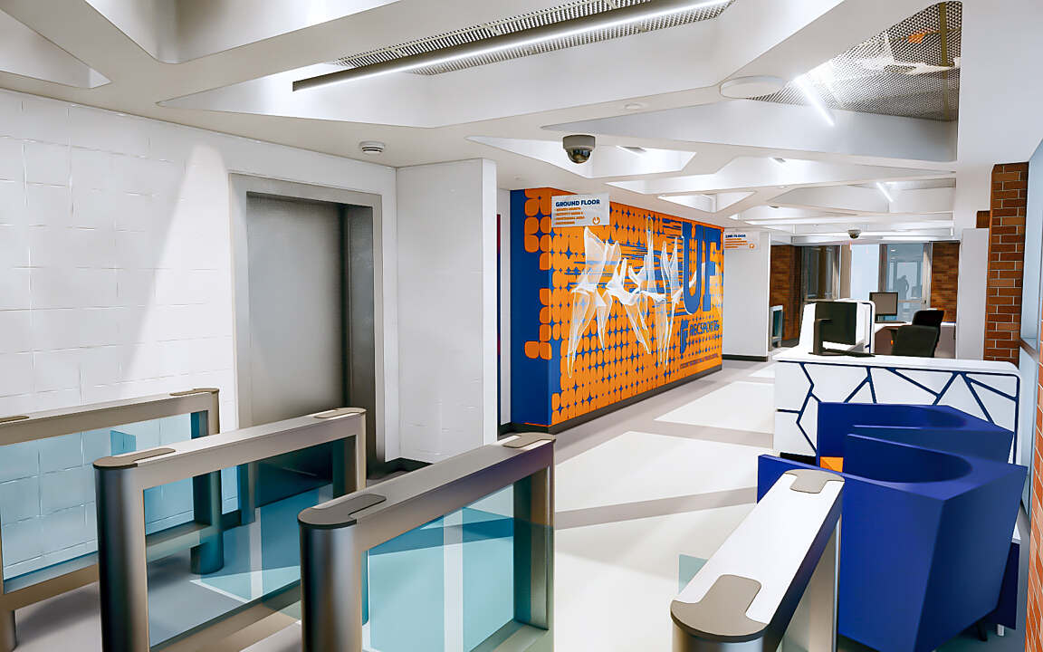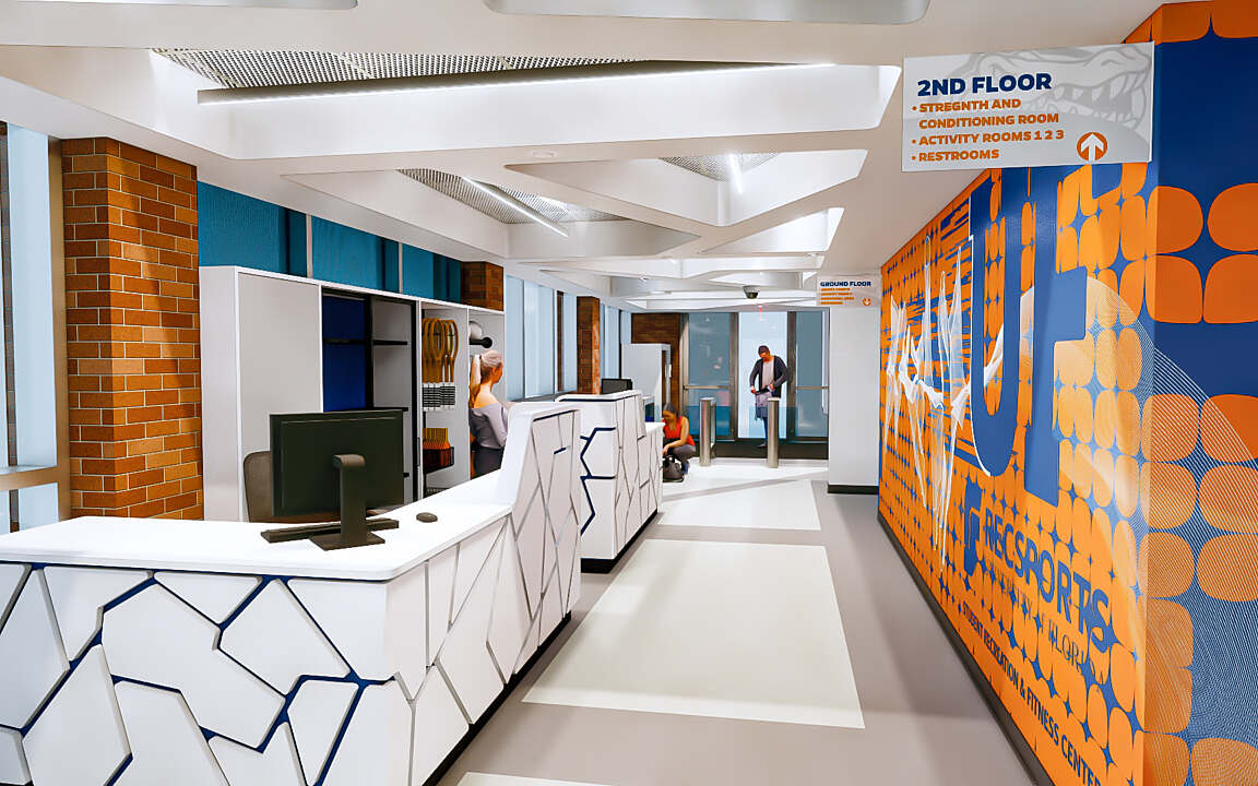 As part of our Annual Continuing Professional Services agreement with the University of Florida, our firm was engaged by the University to perform interior renovations to the Student Recreation and Fitness Center (SRFC) on the main University campus. The firm’s scope of services required the design team to reimagine and renovate the existing entry vestibule/turnstile student check-in area, redesign the reception desk, as well as the equipment check-out area and locker space. The work rectified accessibility deficiencies while also providing an overall brighter, welcoming, and updated appearance. The proposed renovations will consist of new flooring, reception desk casework, ceilings, lighting, and associated power improvements for lighting controls and HVAC / fire protection to allow for higher ceilings.