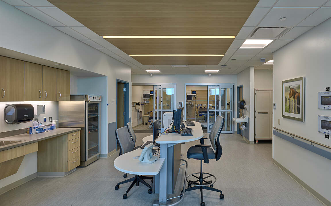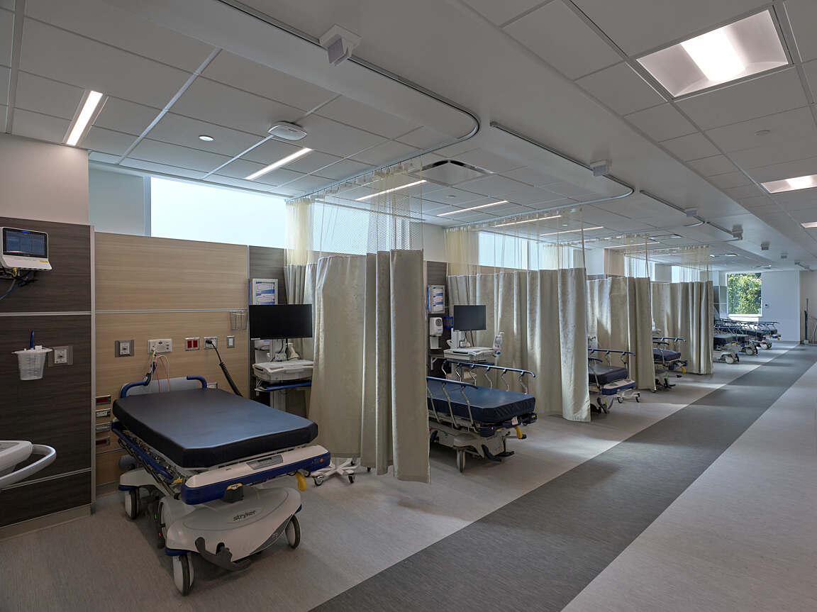 The 23-hour Extended-Stay rooms located within the first floor ASC were designed with optimal patient care in mind. Given that patients undergoing elective surgery typically required monitoring and had limited mobility, each room provided direct access to an accessible toilet room to ensure easy access during their stay, while taking advantage of a quiet, off-stage, distraction free healing environment.