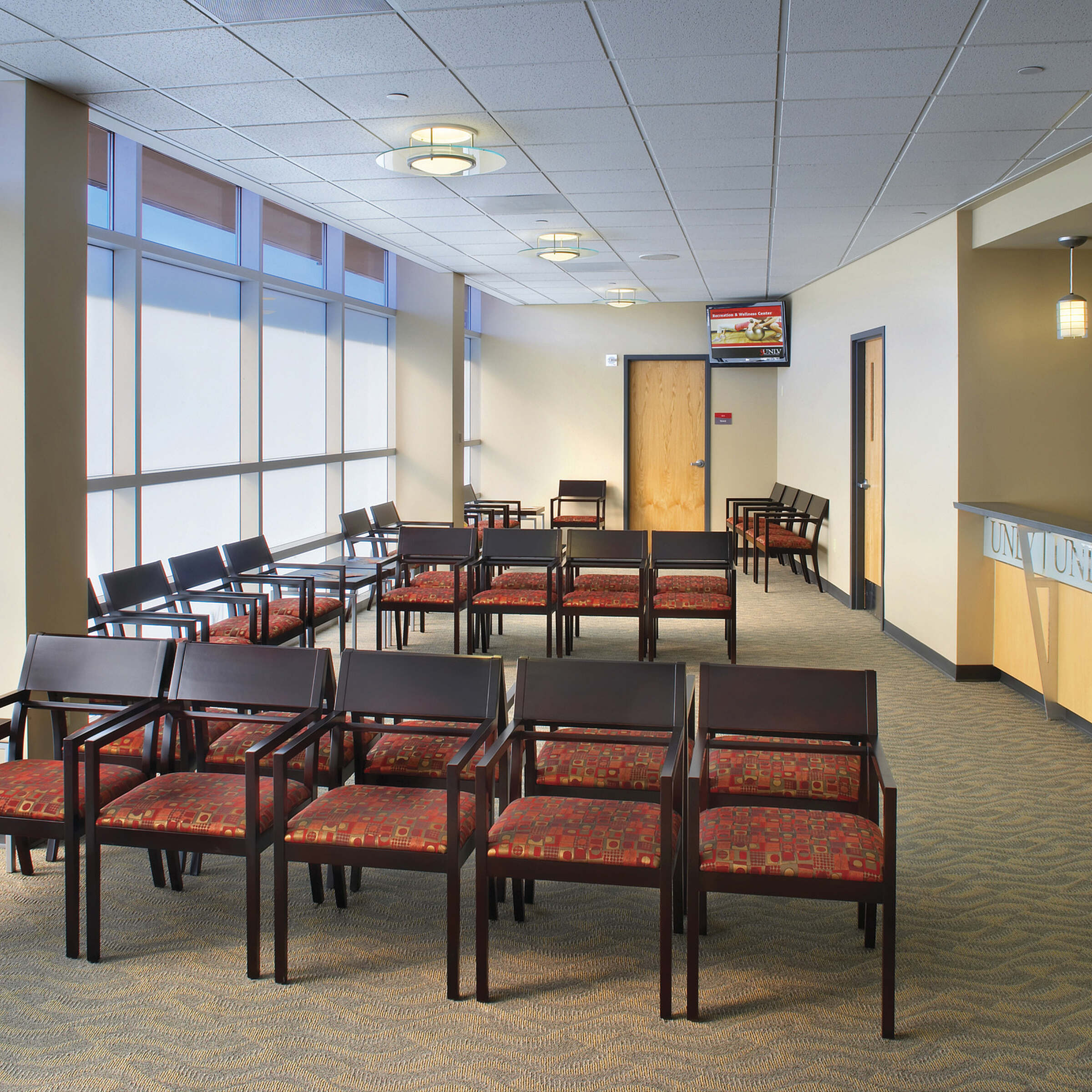A key component is the comprehensive Wellness Center, accessible from the lobby. Connected over three floors and secured separately from the rest of the facility, the Wellness Center houses Student Health Services and Student Counseling & Psychological Services and provides prevention, assessment and education opportunities. On the main level is the reception desk, waiting room, licensed pharmacy, health education classroom and medical records. The next level houses fitness assessment laboratory, therapy/biofeedback space, licensed lab, exam rooms, conference room, nurse station, employee break room and offices for physicians and other professional staff. The third level is the counseling suite for both private and group therapy.