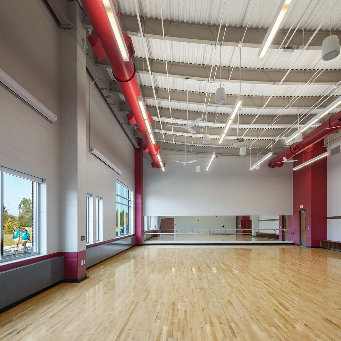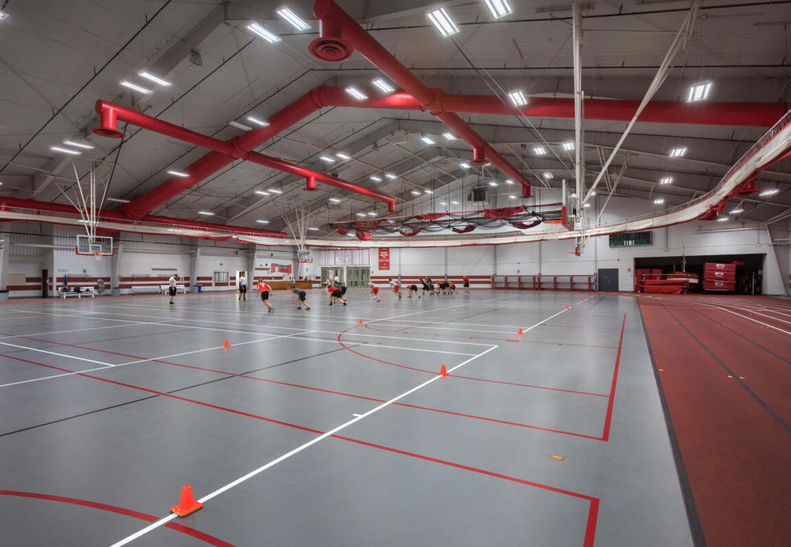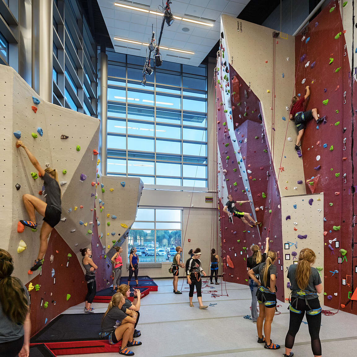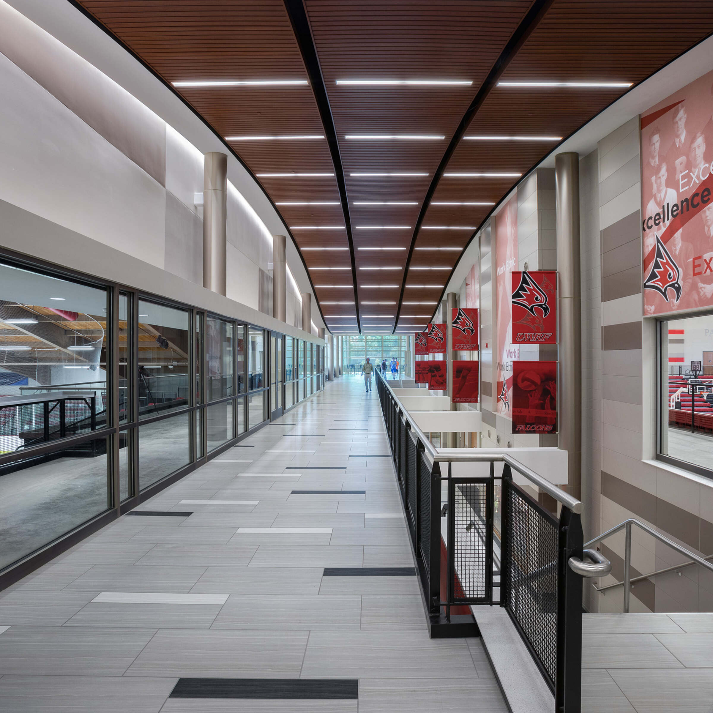 The Knowles Fieldhouse inside the Falcon Center houses a six-lane, 200-M competition track, with a four full-sized basketball courts, five tennis/volleyball courts, a jump pit, throwing cage and two batting cages. A 38’ climbing wall is located at the highest point of one of the serpentine roofs and gradually flows into the fitness and cardio areas.