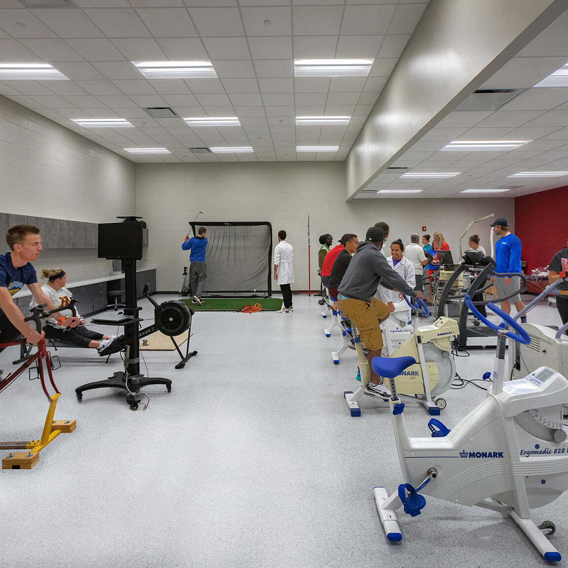 In addition to a large gym and an auxiliary gym, fitness center and a human performance laboratory, the new Falcon Center provides classroom space, training rooms, locker rooms, a dance studio and offices.