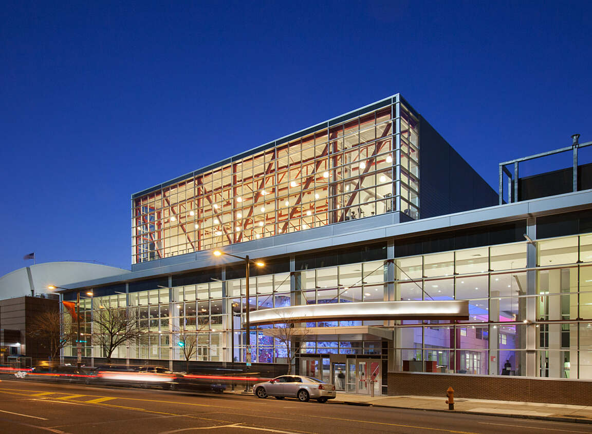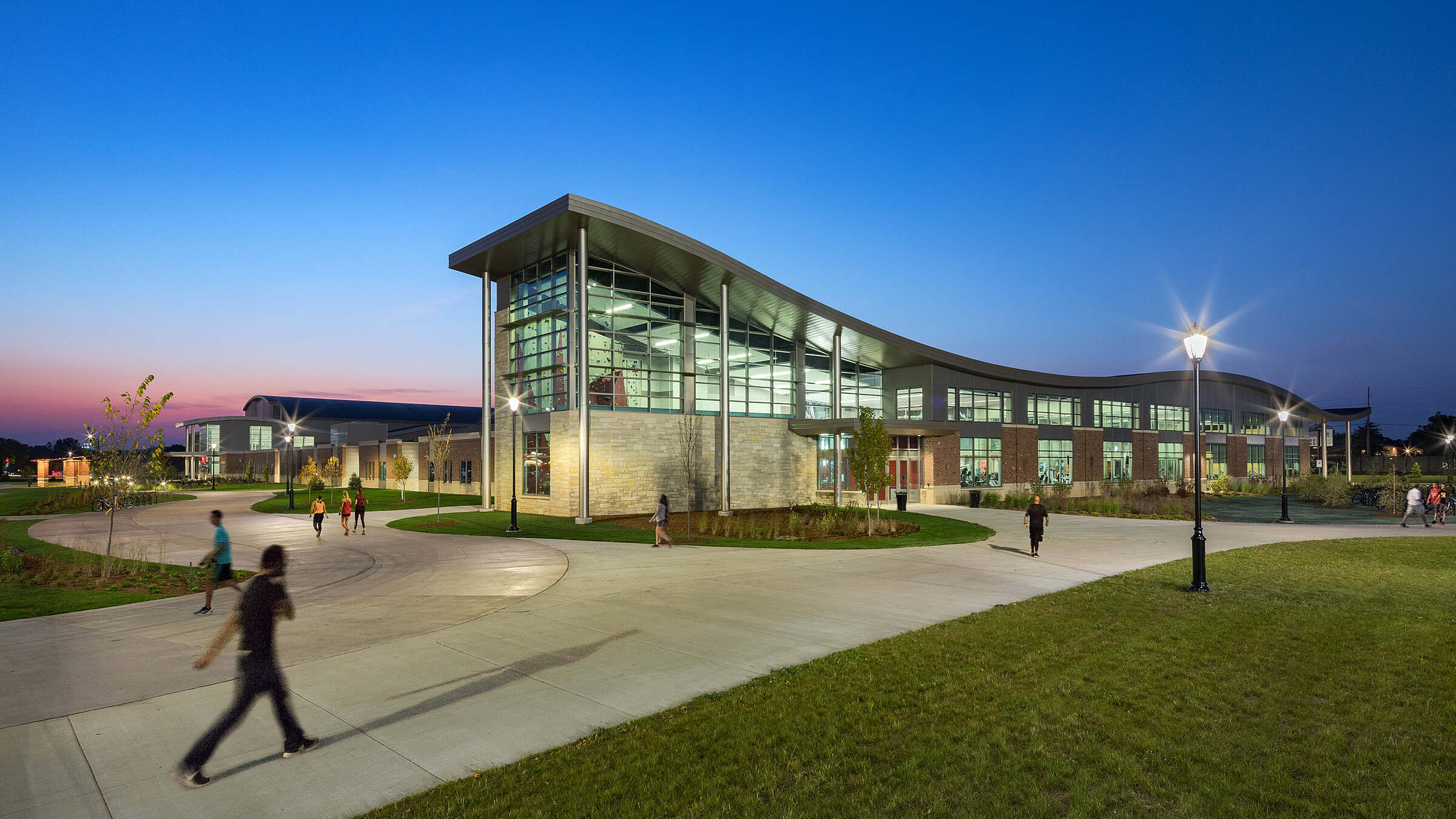 The exterior is clad in brick with limestone at the base and as accents, which acts as a visual reference to the existing Knowles Center and ties into the overall architecture of the main campus. The graceful serpentine roofs at the two entry points allow for varying interior heights, and at night serve as a lantern of the athletic complex.