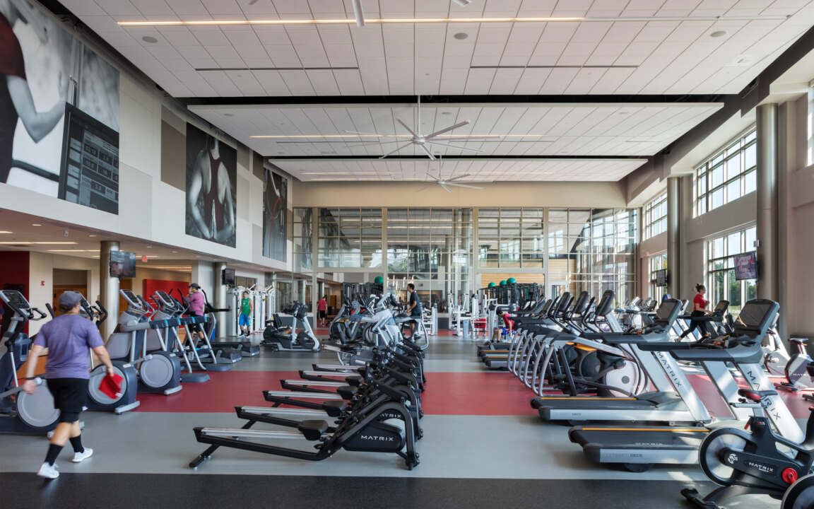 Glass garage doors, which can be opened or closed, separate the cardio fitness and athletic free weight areas and increase the versatility of the space. When closed, the noise from each area is contained but visibility throughout the area is retained.