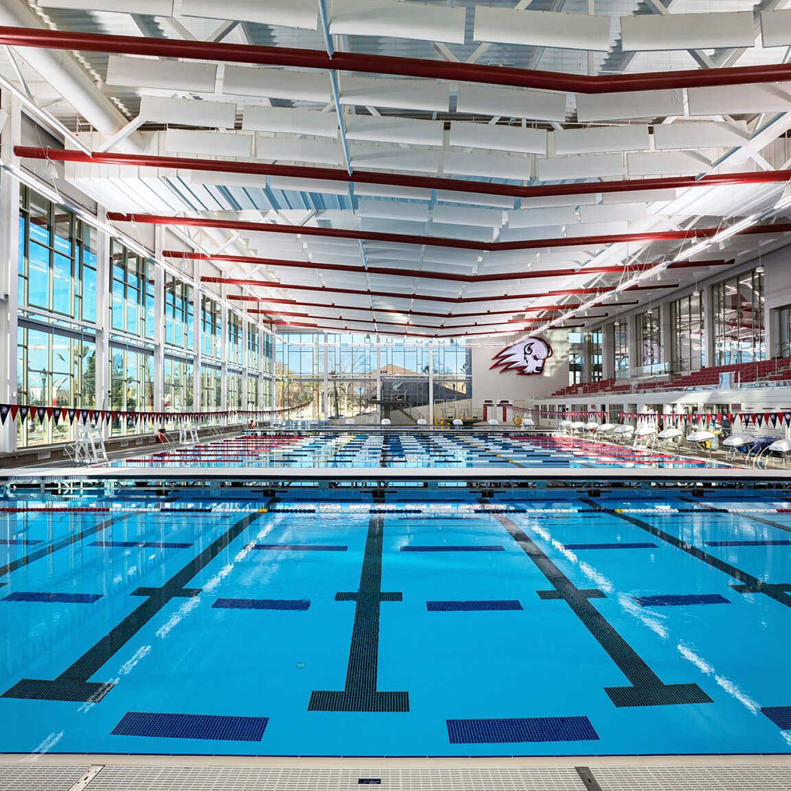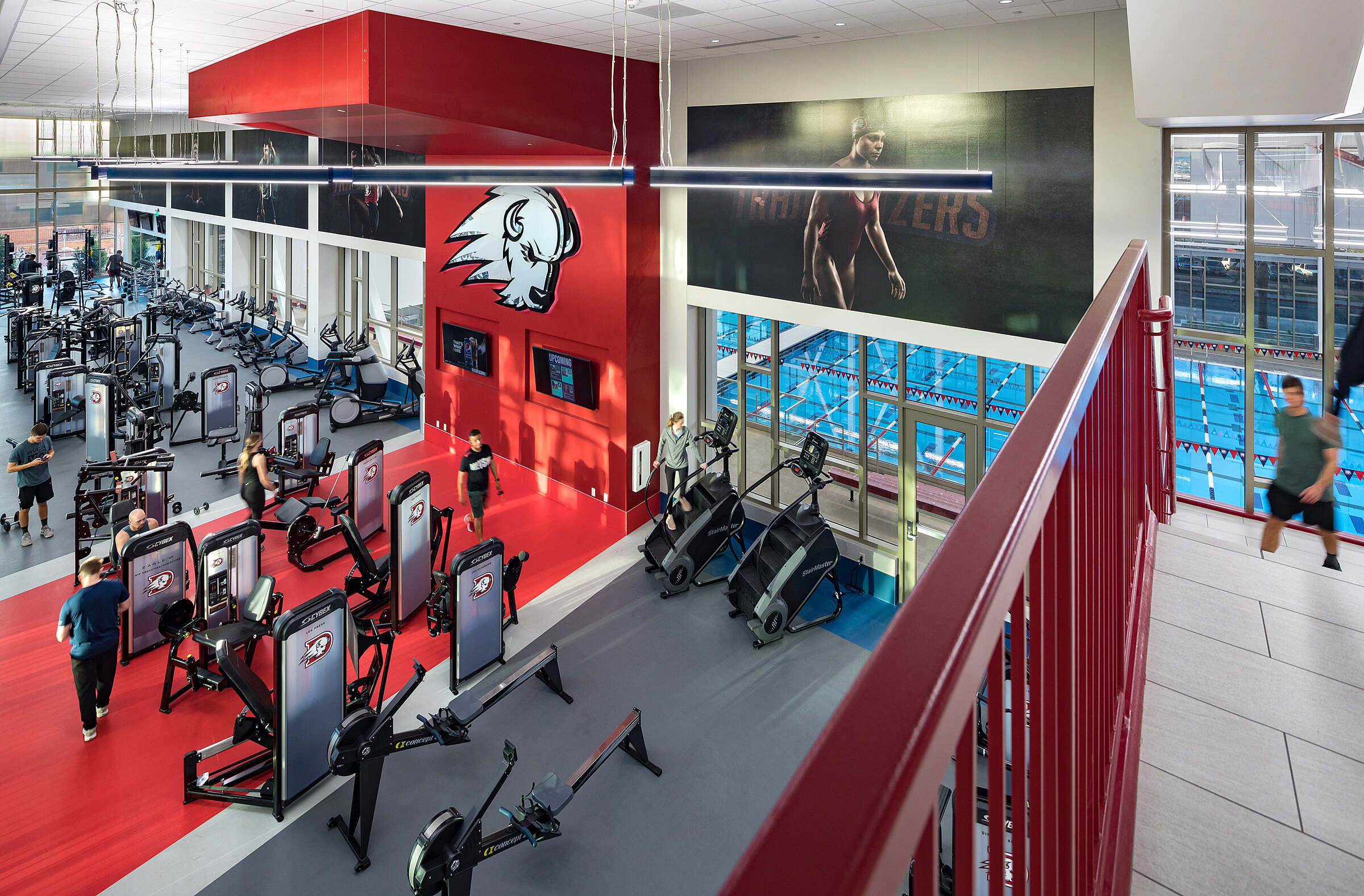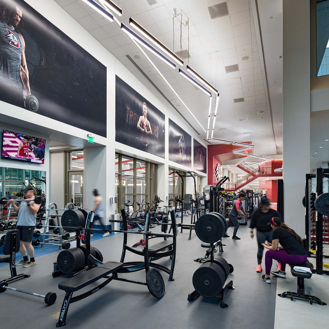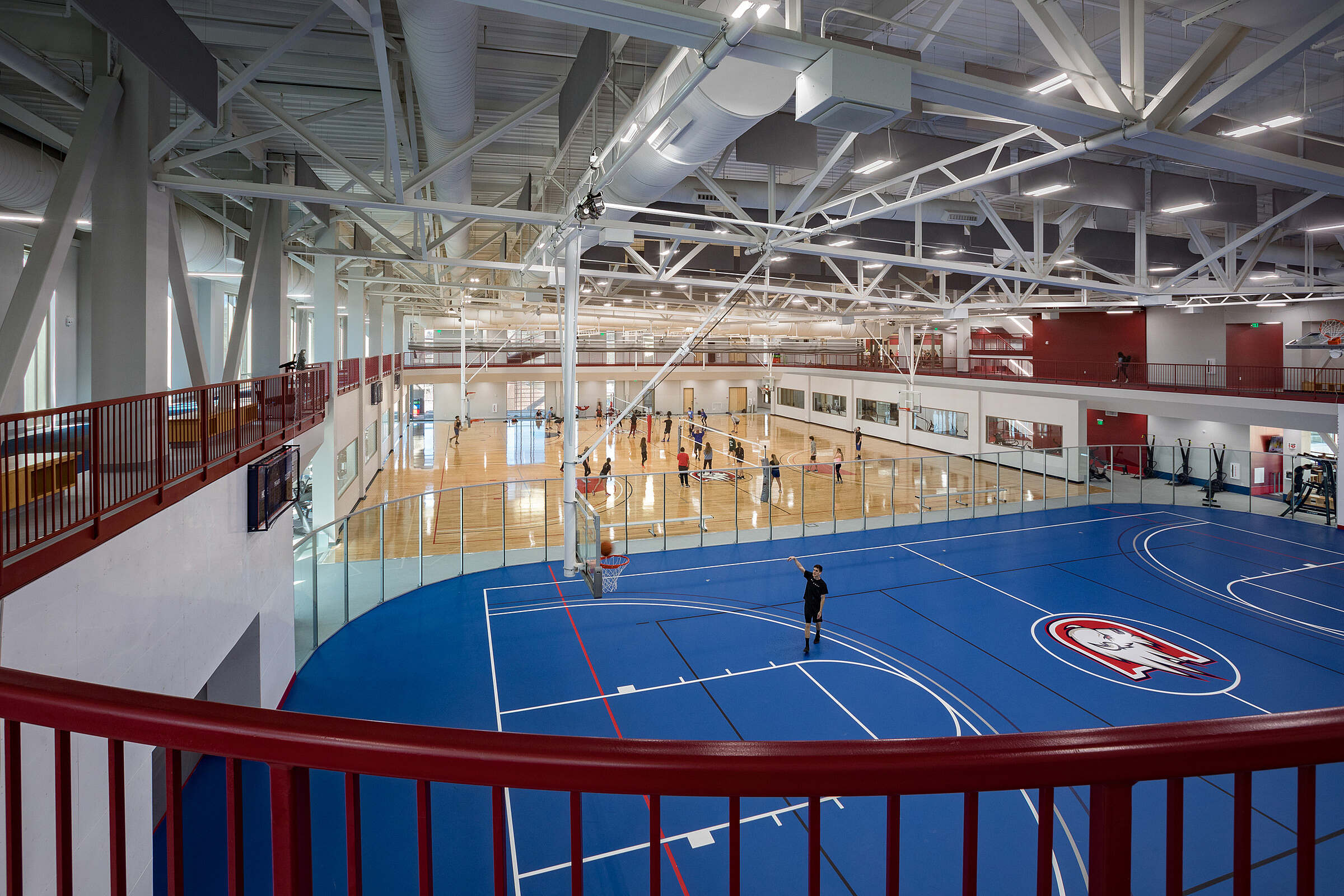 The indoor track offers students a unique training experience, circling above the basketball courts and providing a dynamic view of the action below. The elevated design integrates fitness with the excitement of campus athletics, creating an environment that encourages both performance and community engagement.