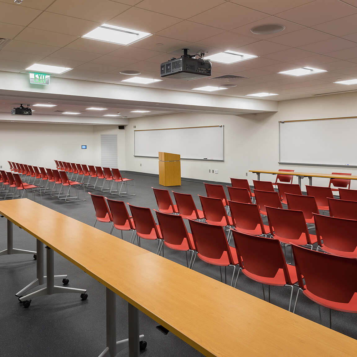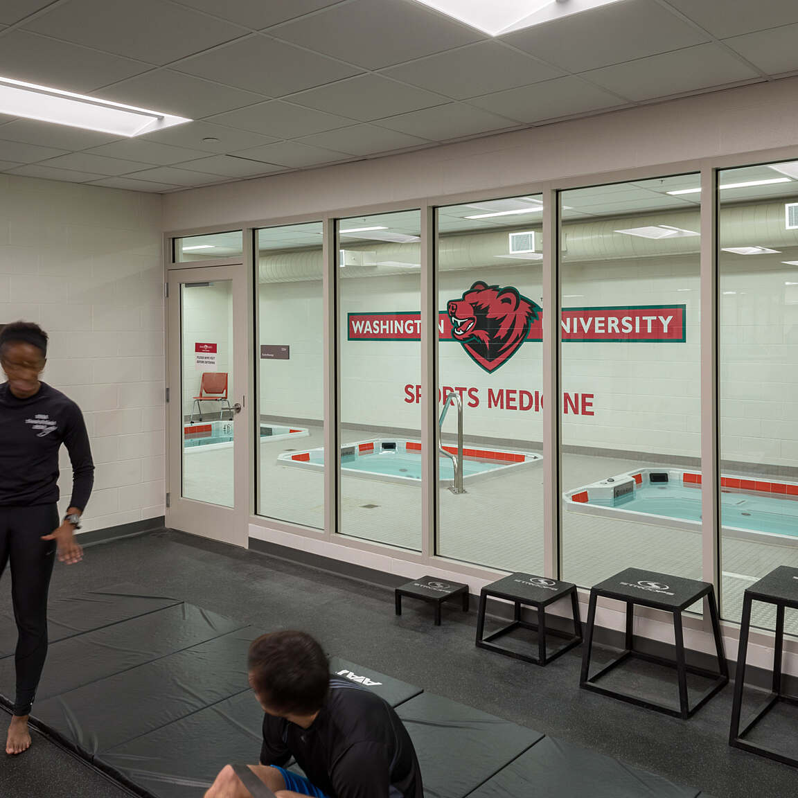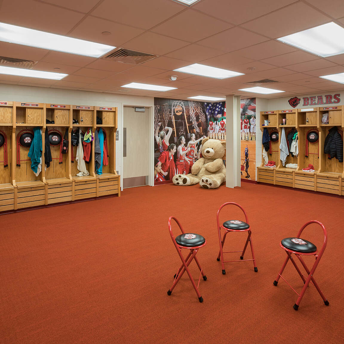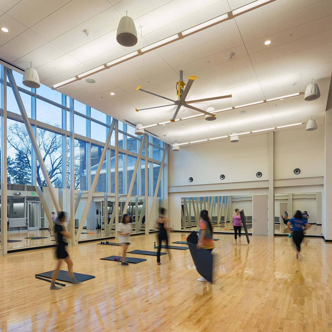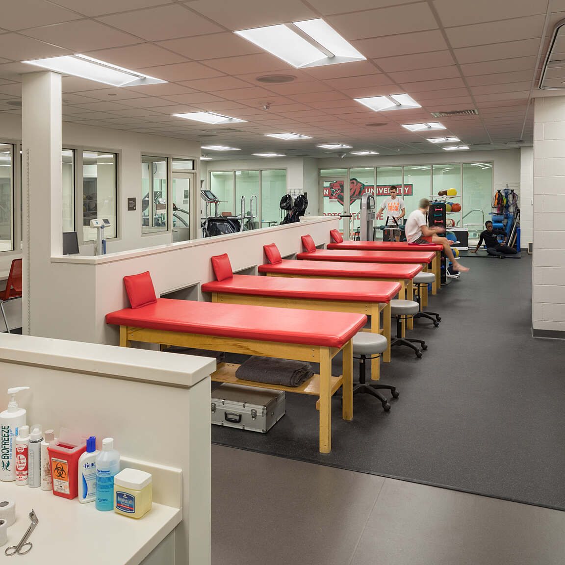 Locker rooms for recreation users as well as varsity athletes and visiting teams are located in the lower level of the center. This level also includes a varsity lounge, a training suite and meeting space. The comprehensive center allows students to have their recreation, fitness and wellness needs in one easily accessible location. Expansive glass windows provide views into the recreation gymnasium from campus, creating visibility and inspiring health and fitness in passersby.