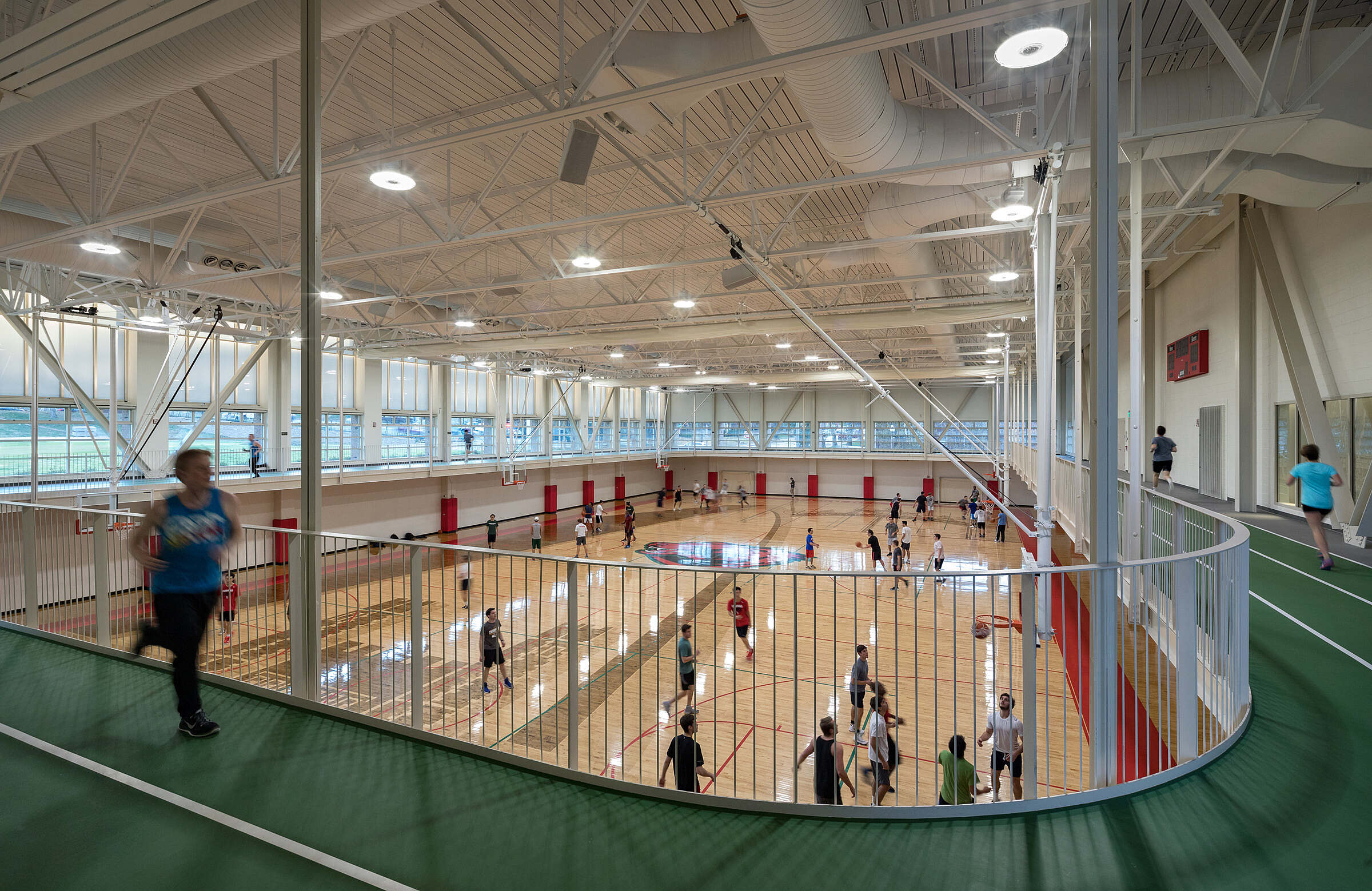 A new three-court gymnasium with a suspended running track was added to the south of the existing field house, consolidating the majority of recreation space into one zone served by a separate controlled entry. This zoning of venues allows for uninterrupted recreational use on game days.