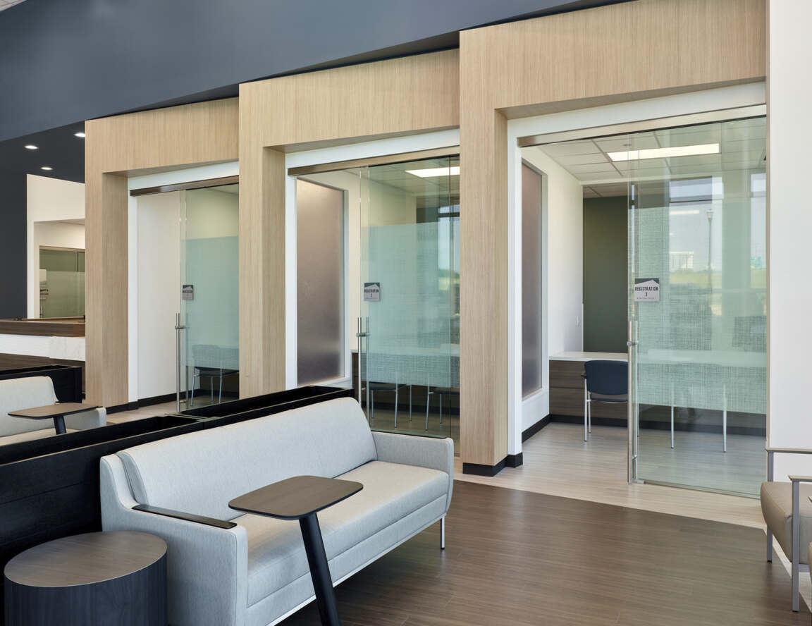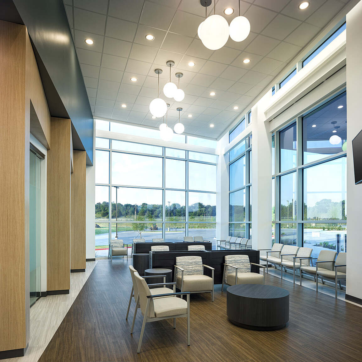 Large windows at the end of corridors and in patient bays maximize sunlight and brighten otherwise confined areas. The interior design embraces simplicity and cleanliness while incorporating playful elements inspired by the building's exterior. The waiting room features high ceilings and globe pendant lights, creating an inviting atmosphere. The same aesthetic continues in the patient care area, resulting in a cohesive, neutral and timeless palette that avoids a sterile appearance.