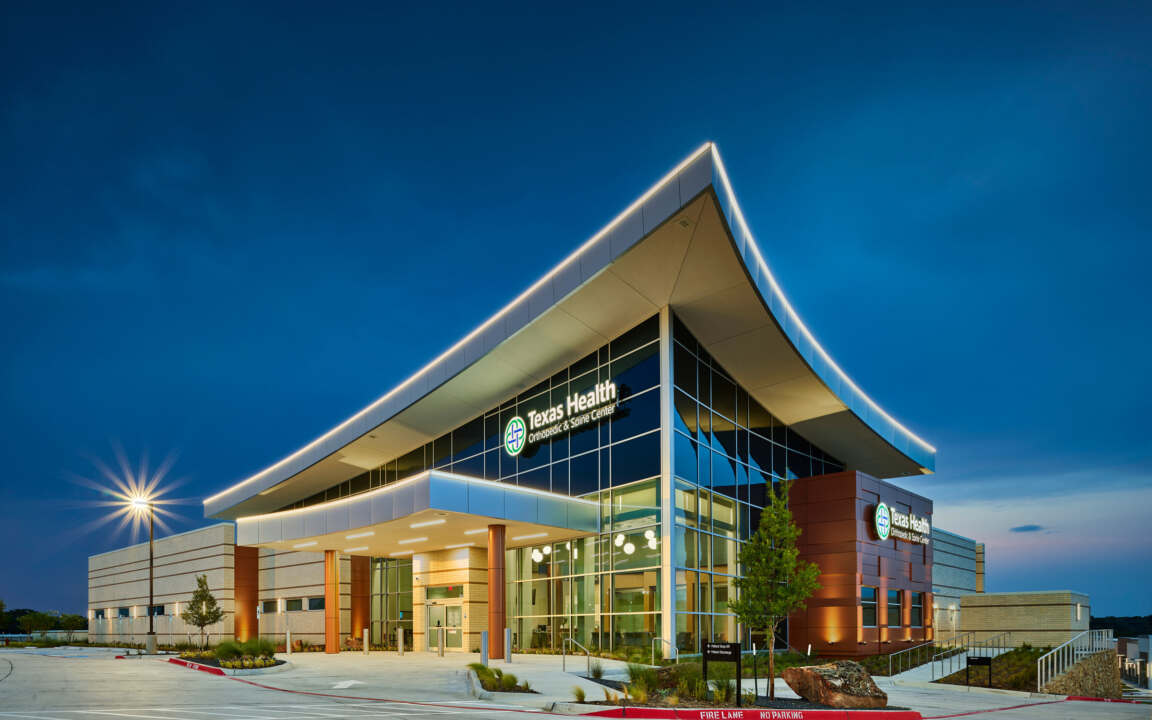 The Willow Park Surgery Center specializes in orthopedic care, with a focus on joints, spine, and pain management procedures. The Surgery Center was strategically designed to stand out as a prominent city landmark visible from all directions. The building's elevated location, with a curved pop-up feature extending up to 44 feet and a front façade of curtainwall glass, creates a visually striking structure. Vibrant metal panels add a modern touch and contrast with the brick façade.