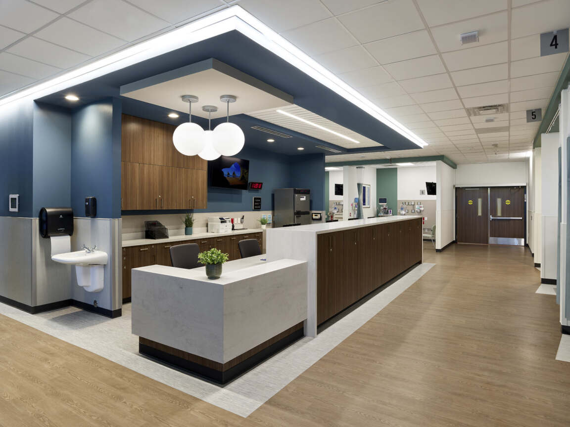 The nurse station is thoughtfully and stylishly designed to provide nursing staff an open and pleasant environment conducive to productivity.